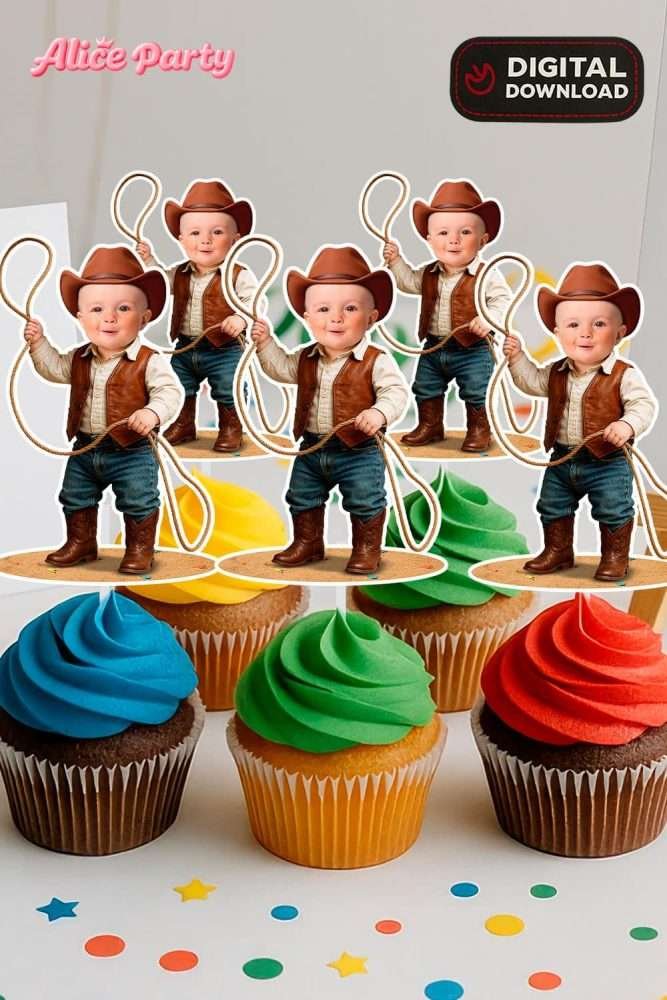Personalized Cowboy Baby Cupcake Toppers – First Rodeo Birthday Party Decoration – Delivered in 24h – Digital File