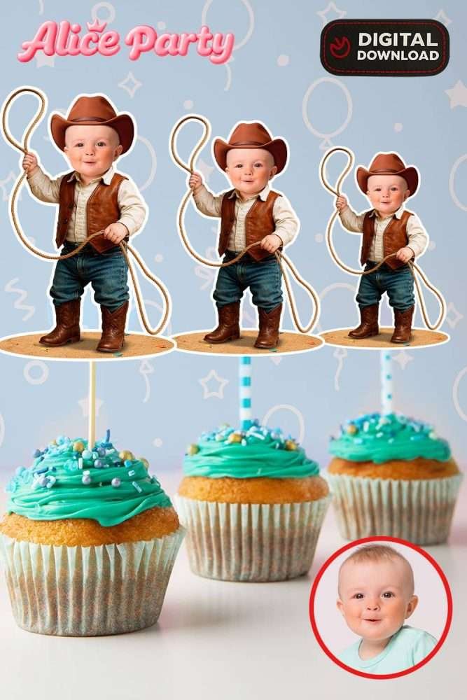 Celebrate your baby’s First Rodeo with our Personalized Cowboy Baby Cupcake Toppers. Custom photo design, perfect for western and cowboy birthday parties.