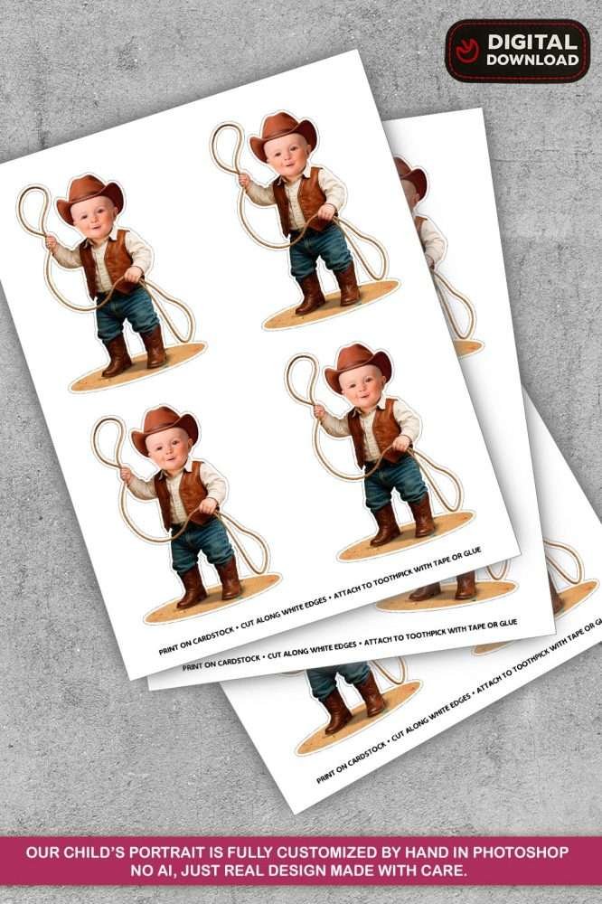Saddle up and celebrate in style! These Personalized Cowboy Baby Cupcake Toppers turn your little one into a rodeo star — riding tall above birthday cupcakes in full cowboy gear, hat and all. Perfect for a First Rodeo birthday, western-themed parties, or any cowboy celebration.