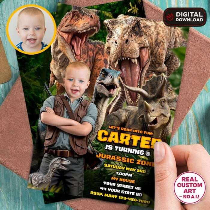 Personalized Dinosaur Birthday Invitation – Jurassic Birthday Photo Invitation – Delivered in 24h – Digital File