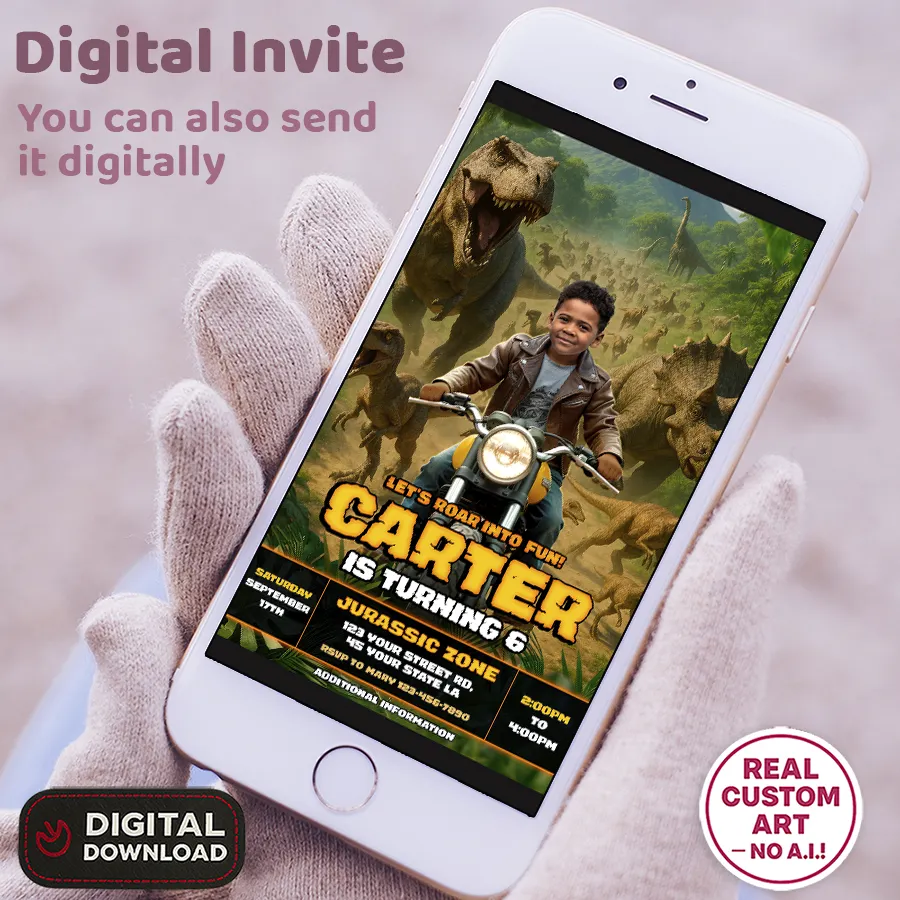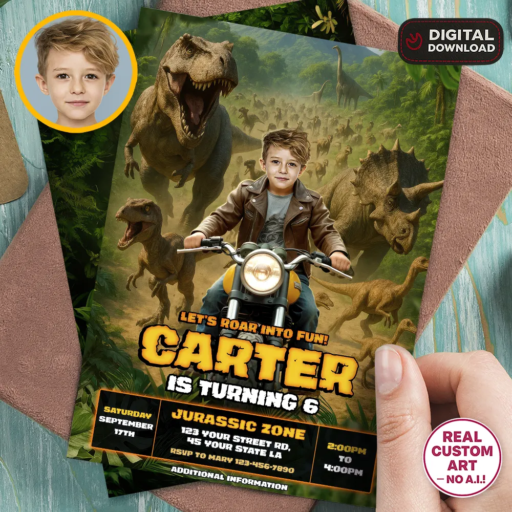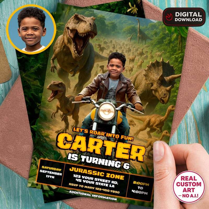 Personalized Dinosaur Moto Birthday Invitation with Photo – Jurassic Birthday Theme – Delivered in 24h – Digital File