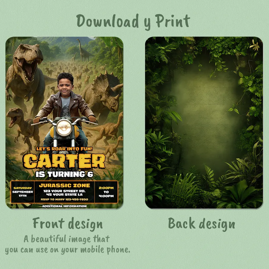 You’ll get a high-resolution JPEG file (300 DPI) personalized with your child’s photo, name, age, and party details in a bold Jurassic Dinosaur Moto theme. Standard size is 5×7 inches, ideal for printing or digital sharing.