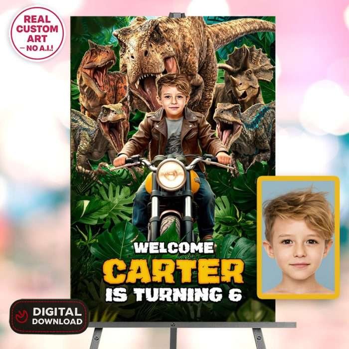 Turn your child’s birthday into a prehistoric race with our Personalized Dinosaur Moto Welcome Sign! 🦖🏍️