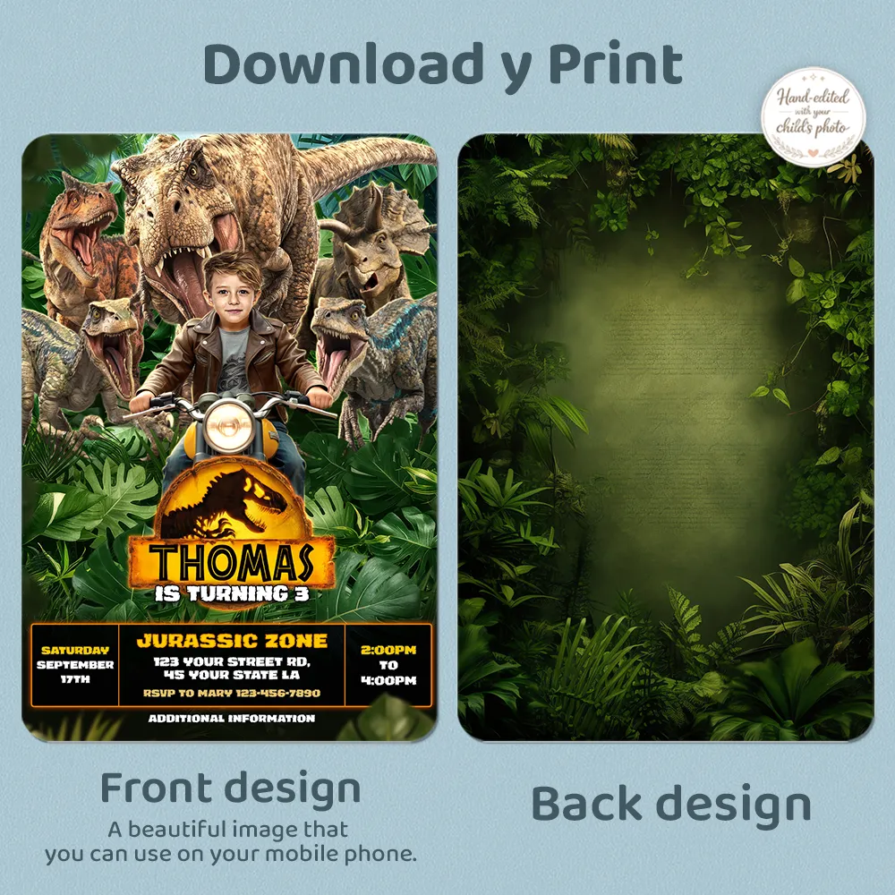 You’ll get a high-resolution JPEG file (300 DPI) personalized with your child’s photo, name, age, and party details in a bold Dinosaur Motorcycle theme. Standard size is 5×7 inches (horizontal layout), ideal for printing or digital sharing.