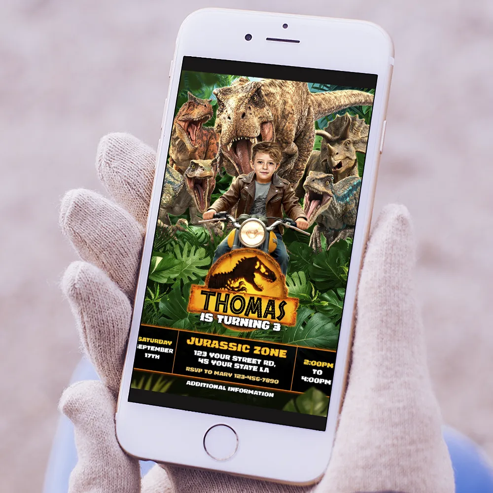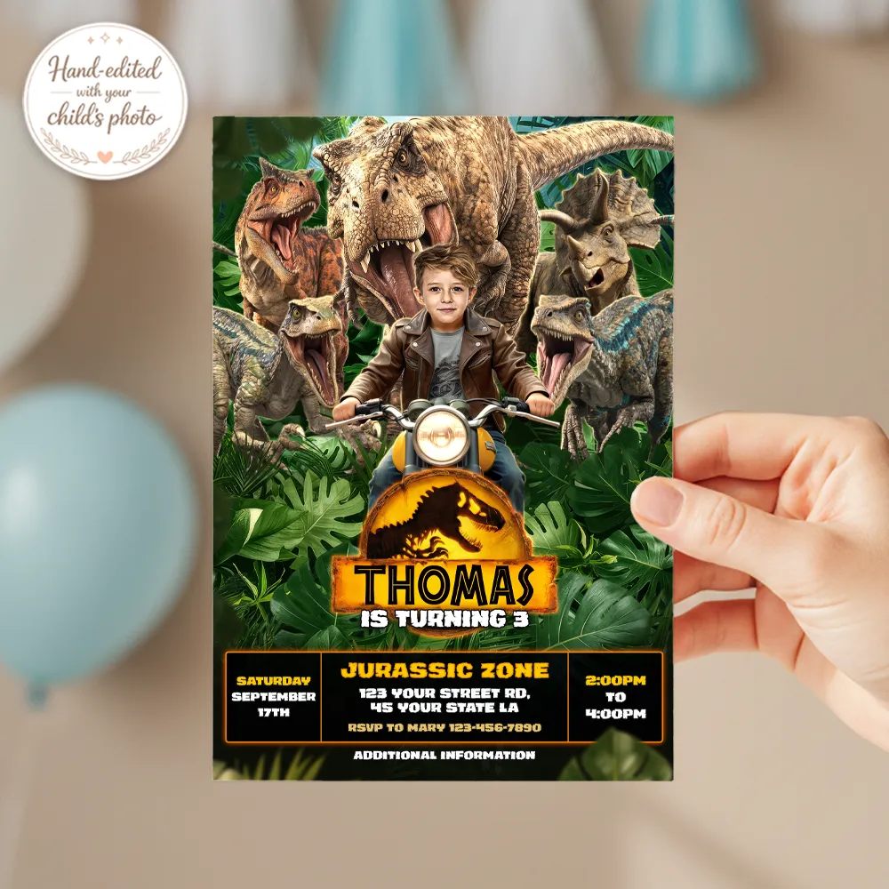 Start your engines for a prehistoric adventure! 🦖🏍️ Our Personalized Dinosaur Motorcycle Birthday Invitation with Photo (Horizontal 5×7, Digital File) transforms your child into the hero of a Jurassic race — riding a motorcycle with a herd of dinosaurs racing close behind. Perfect for boys who love dinosaurs, speed, and excitement, this dynamic design sets the stage for a birthday celebration full of thrills and unforgettable memories.