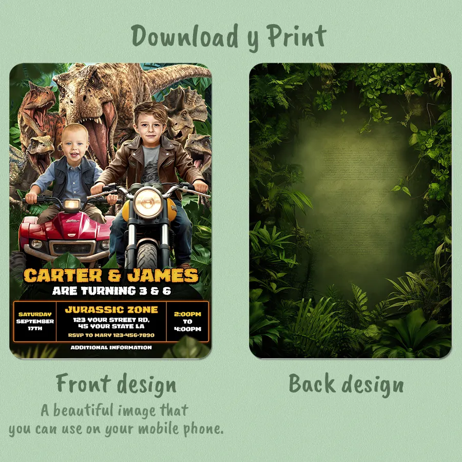 You’ll get a high-resolution JPEG file (300 DPI) personalized with your children’s photos, names, ages, and party details in a bold Dinosaur Quad & Motorcycle Twins theme. Standard size is 5×7 inches (horizontal layout), ideal for printing or digital sharing.