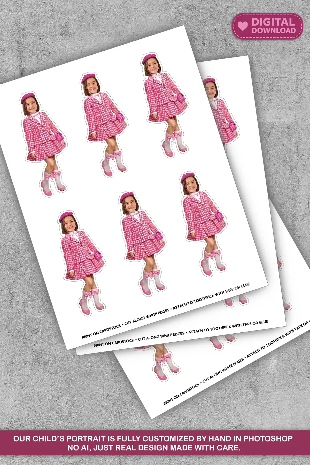 Personalized Doll Box Cupcake Toppers with your child’s face. Digital download includes 4 toppers per sheet. Personalized by hand, no AI used.