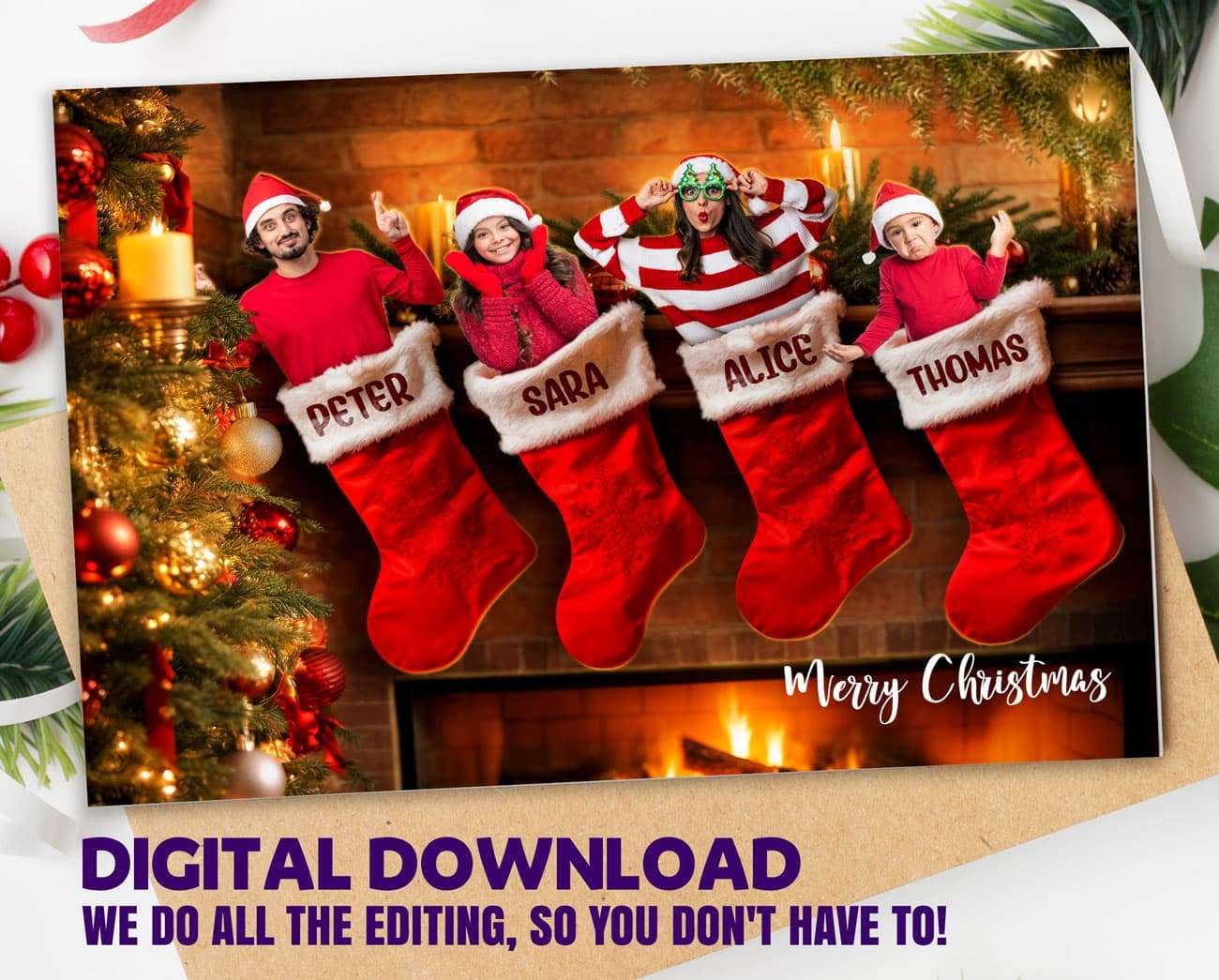 Personalized Family Christmas Stocking Photo Card – Custom Holiday Greeting – Delivered in 24h – Digital File