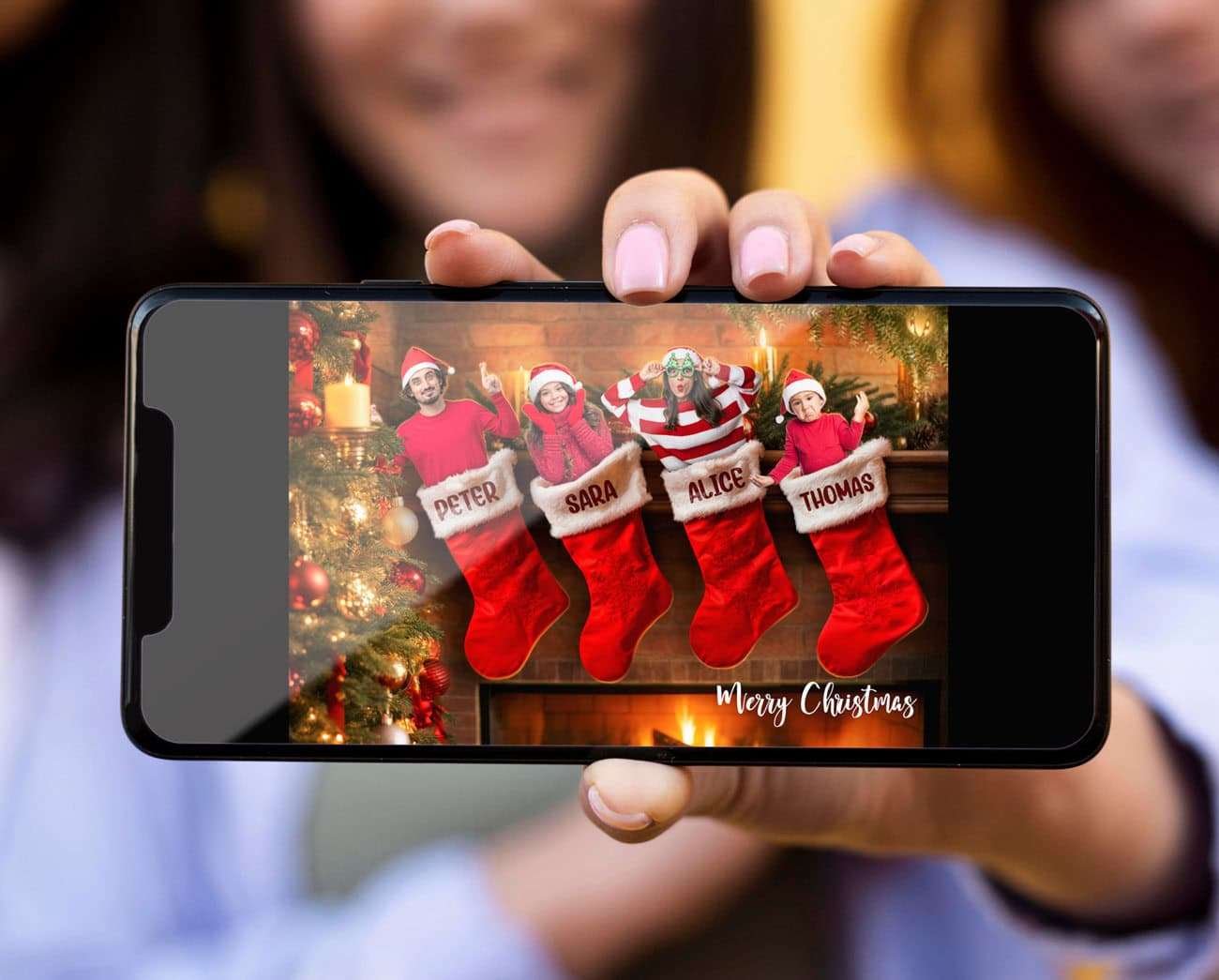 Your family’s faces are seamlessly integrated into the Christmas stockings, with expert lighting, shadows, and holiday details for a polished, lifelike result.