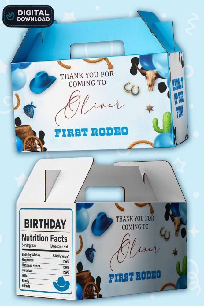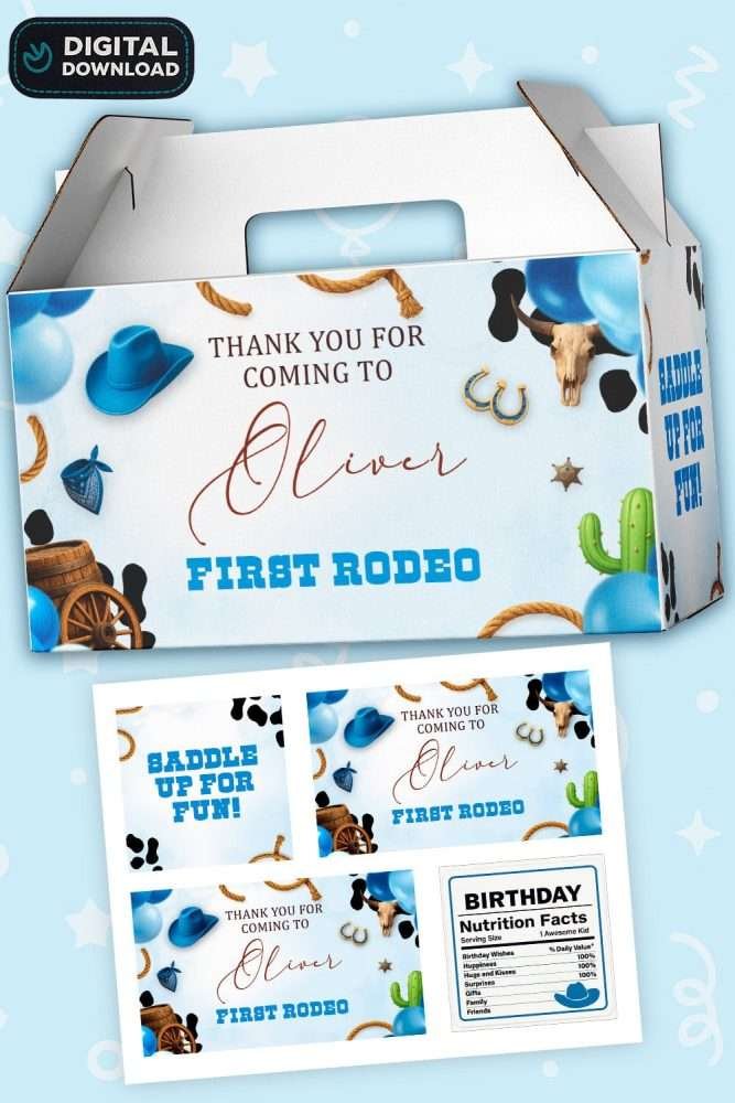 Personalized First Rodeo Blue Birthday Labels – Digital Sticker Set for Gable Boxes – Made to Order File