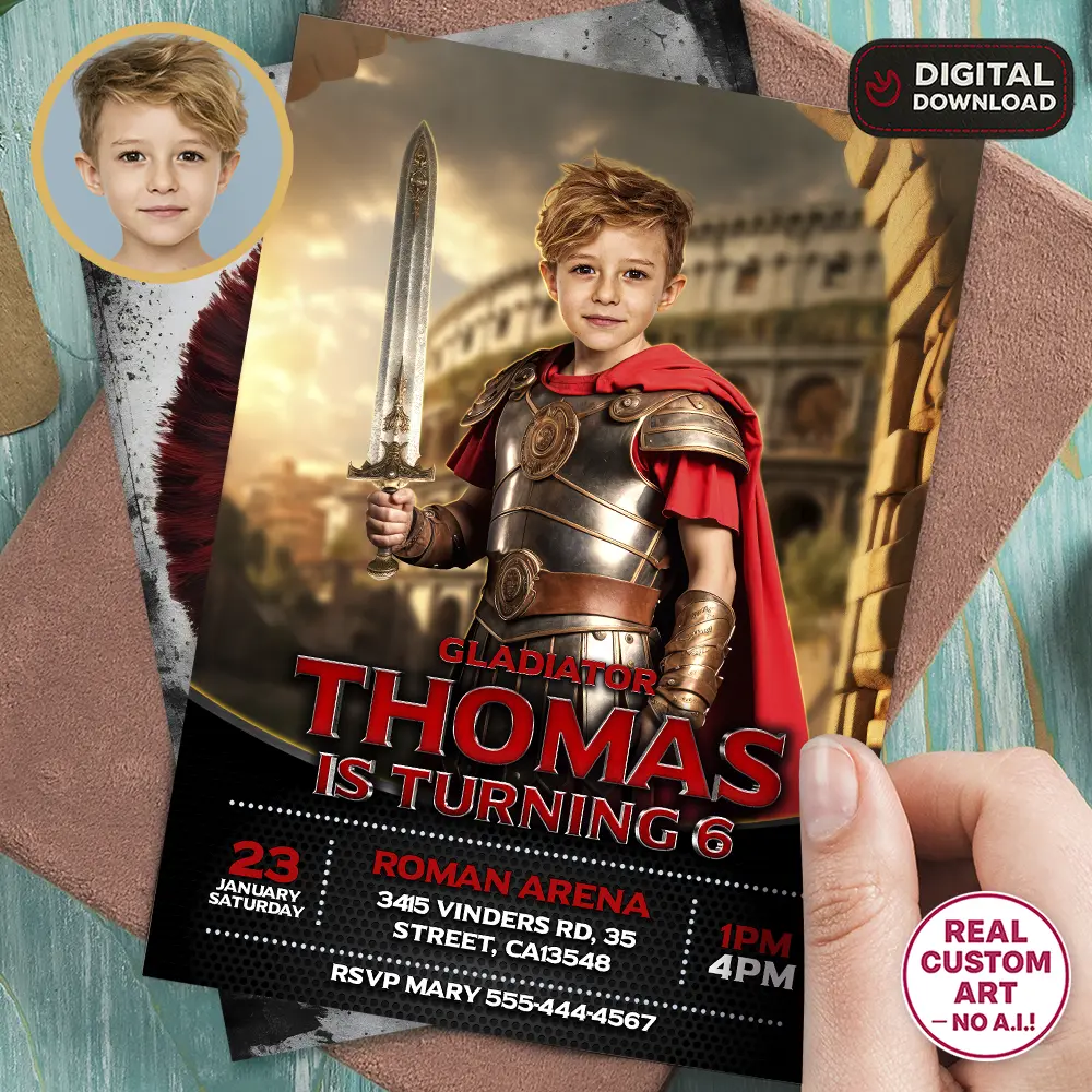 Each invitation is hand-edited in Adobe Photoshop — no AI, no templates. Your child’s photo is seamlessly integrated into a stunning gladiator scene with natural skin tones, realistic shadows, and artistic details that bring the ancient arena to life. The result: a heroic invitation that stands out and sets the stage for an unforgettable birthday.