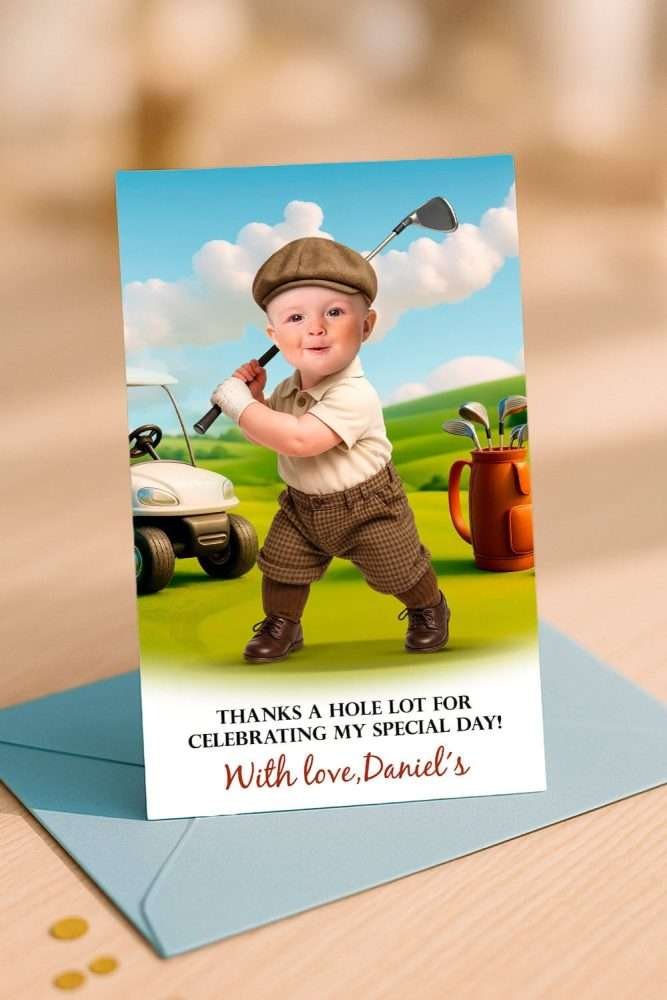 Whether you celebrated a 1st birthday or a toddler’s 2nd, 3rd, or 4th birthday, this thank-you card keeps the golf spirit alive while sending heartfelt thanks to family and friends.