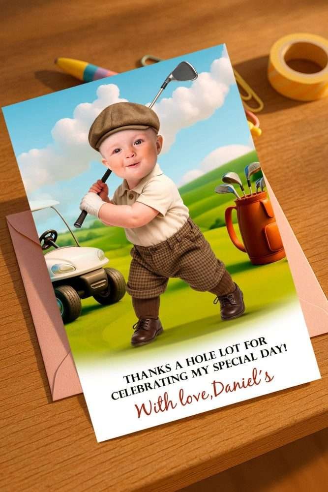 3️⃣ We handcraft your design — your child becomes the star of a fun golf thank-you card.
