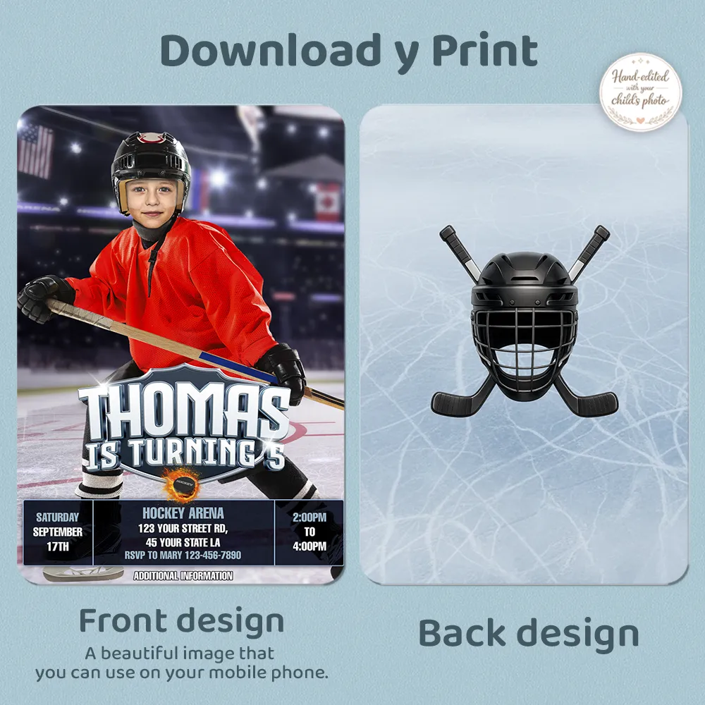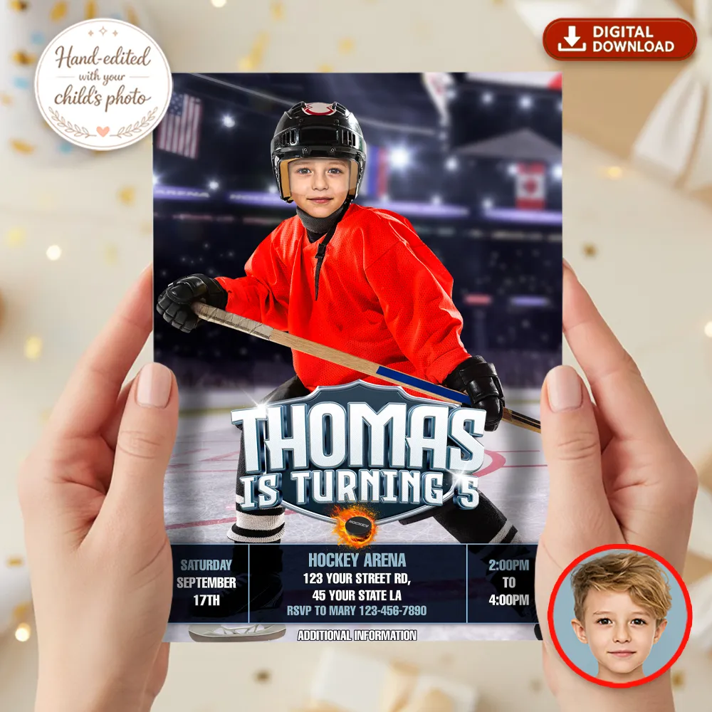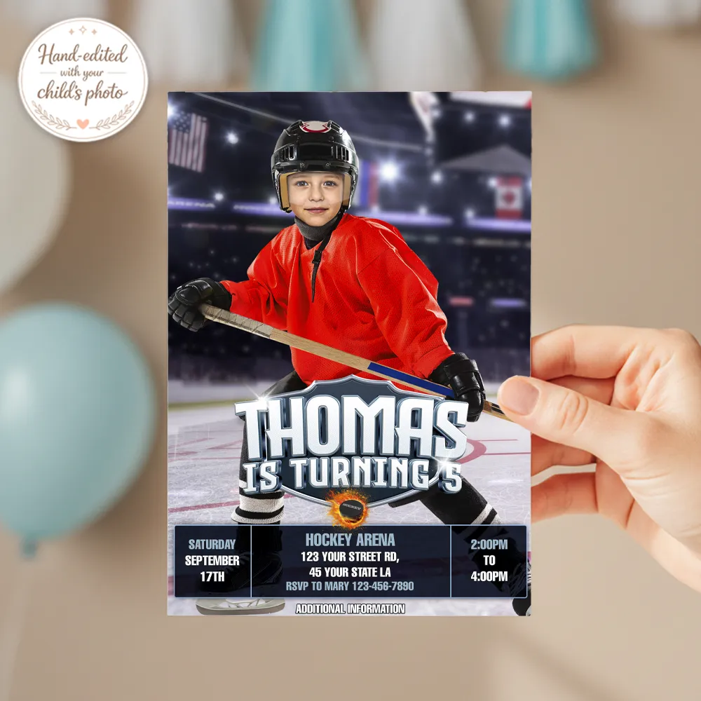 Custom Ice Hockey Birthday Photo Invitation, fully personalized with your child’s photo. Hand-edited, fast delivery, and perfect for hockey-themed parties.