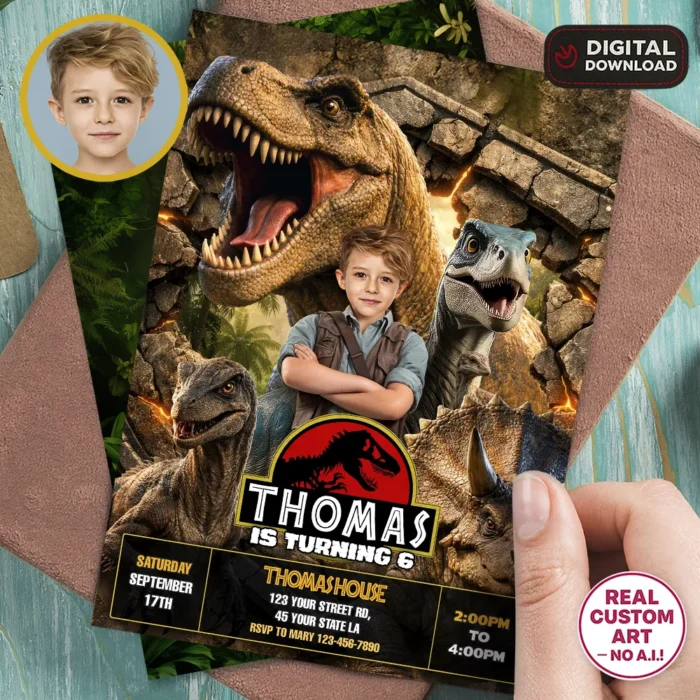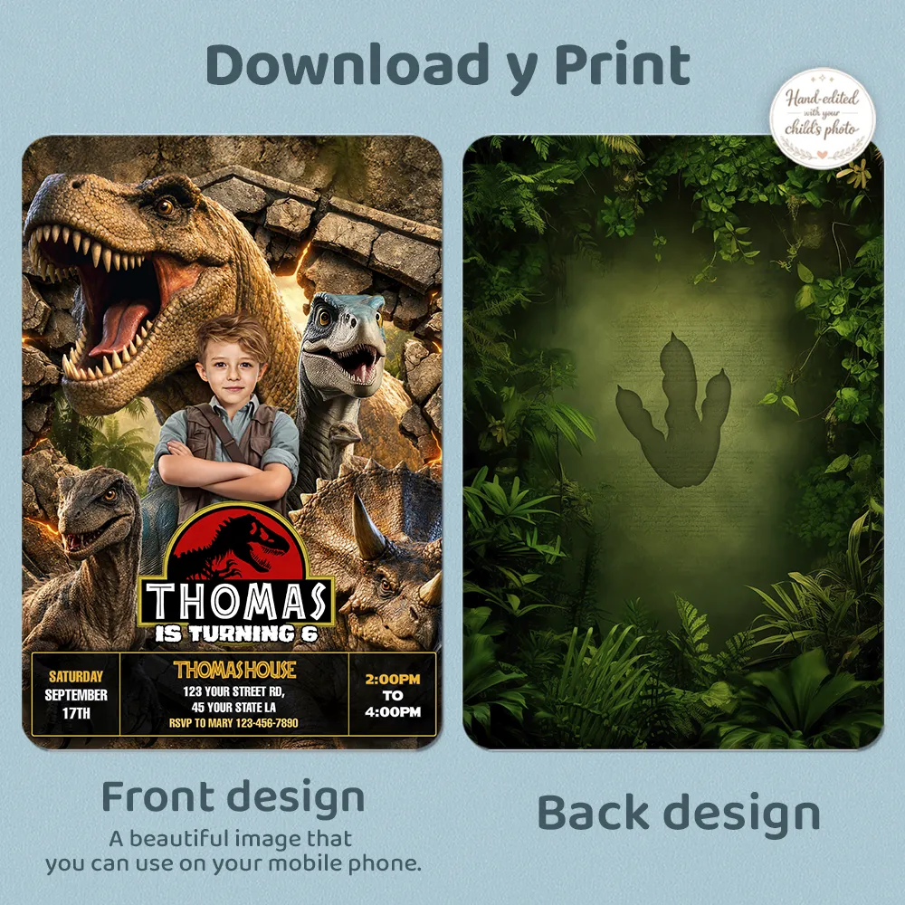You’ll get a high-resolution JPEG file (300 DPI) personalized with your child’s photo, name, age, and party details in a bold Jurassic Dinosaur Moto theme. Standard size is 5×7 inches, ideal for printing or digital sharing.