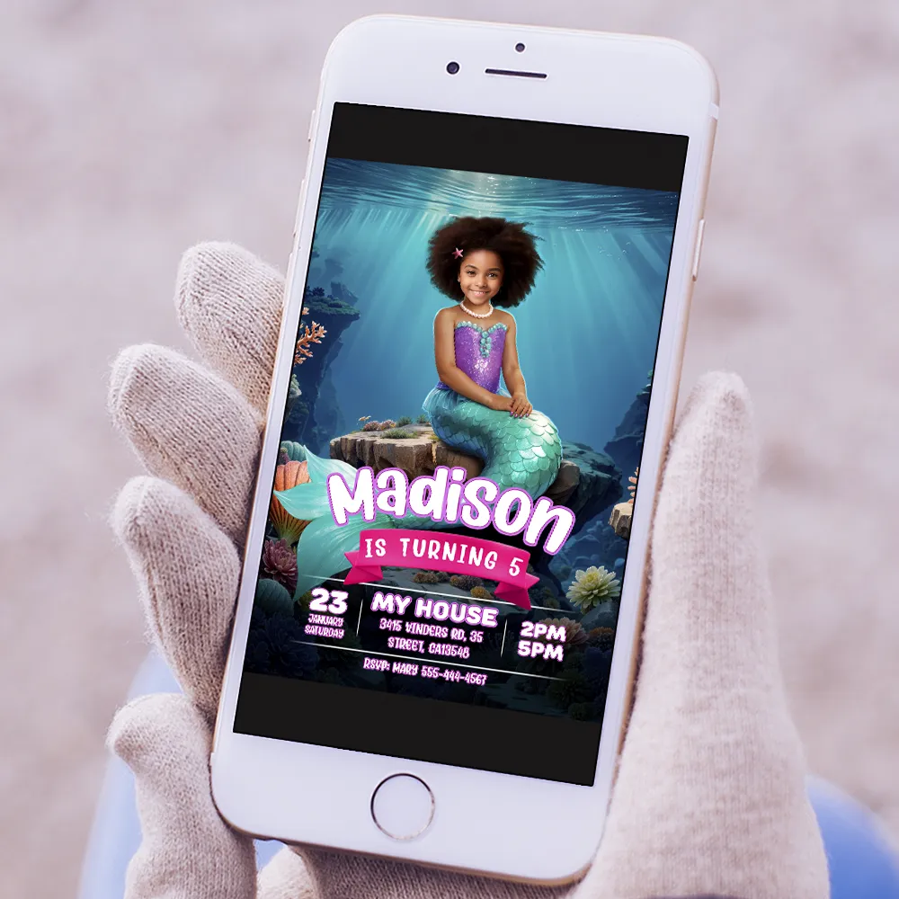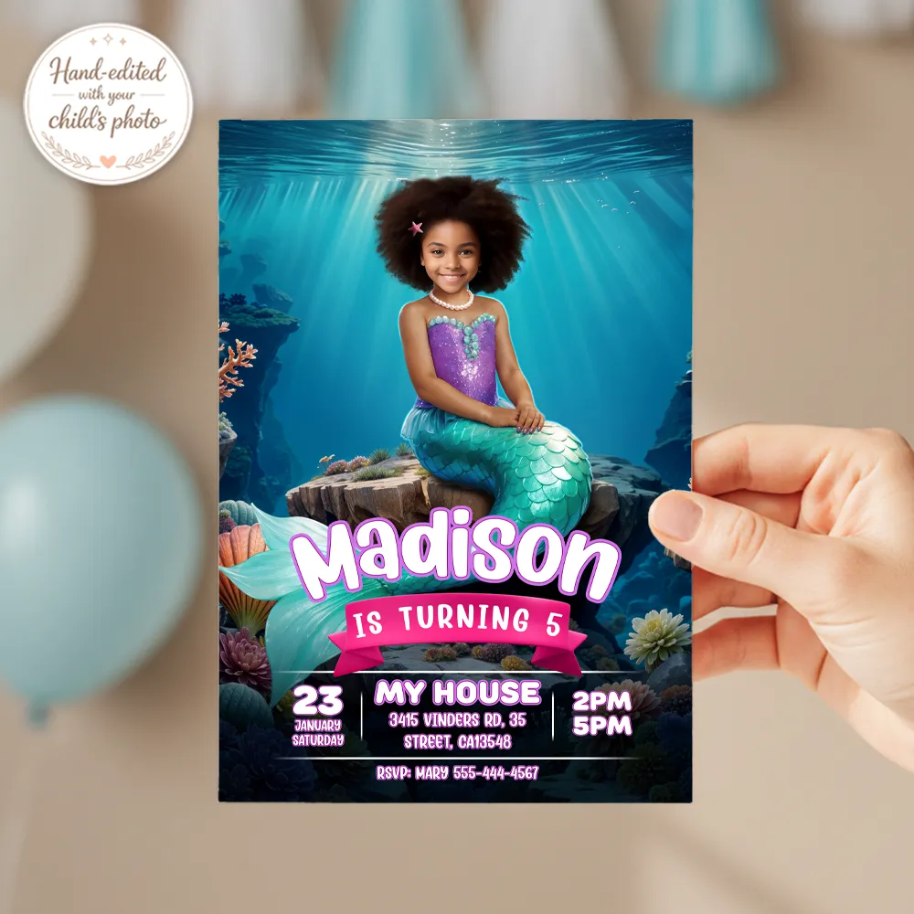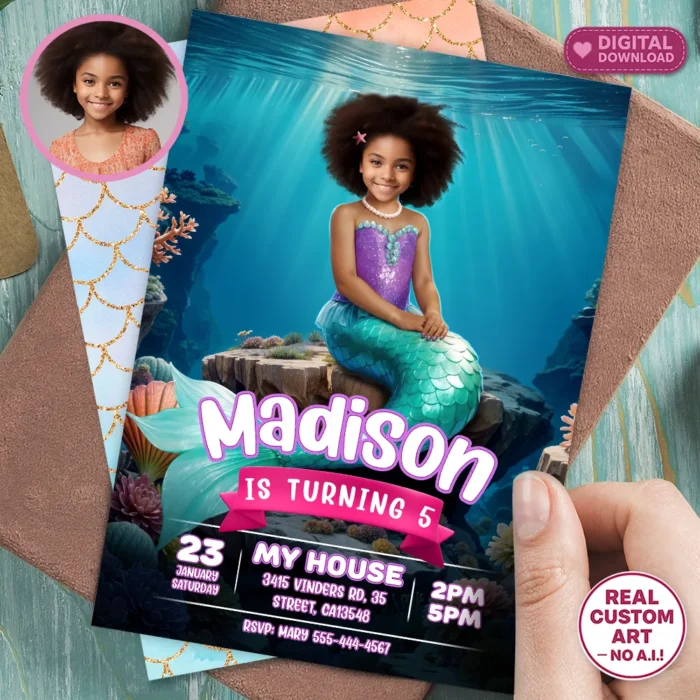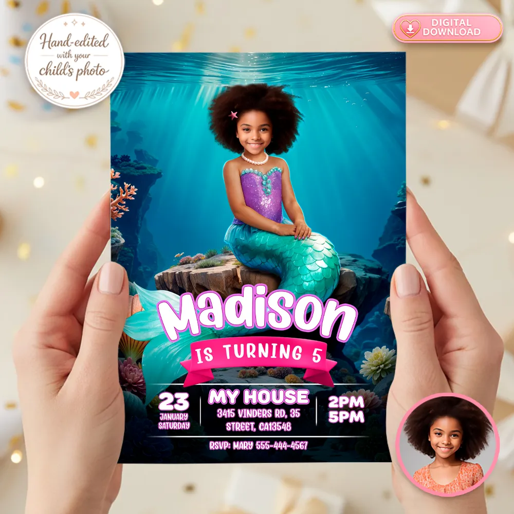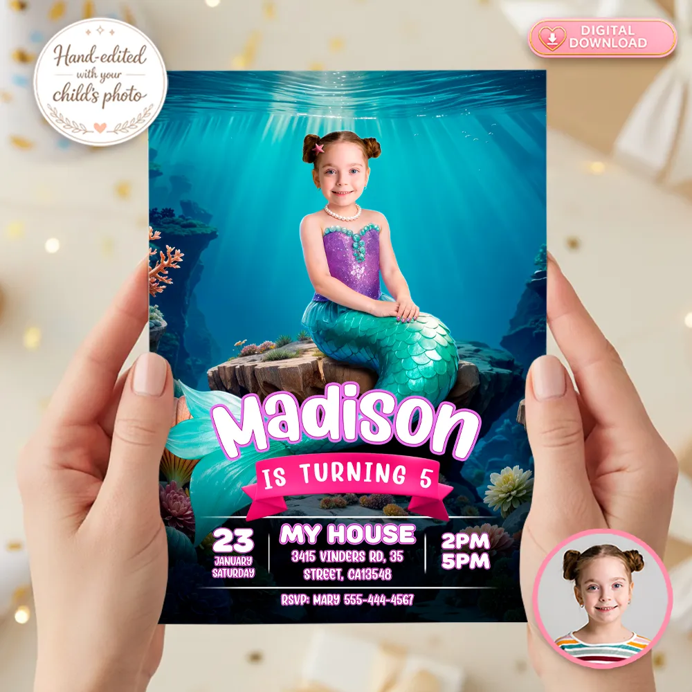 Make her birthday magical with a Personalized Mermaid Birthday Invitation! Custom design using your child’s photo – Digital file, ready in 24h.