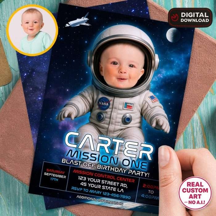 👉 Celebrate your baby’s Mission One with our Personalized Mission One Birthday Invitation with Photo 🚀 Hand-edited design, no templates or AI.