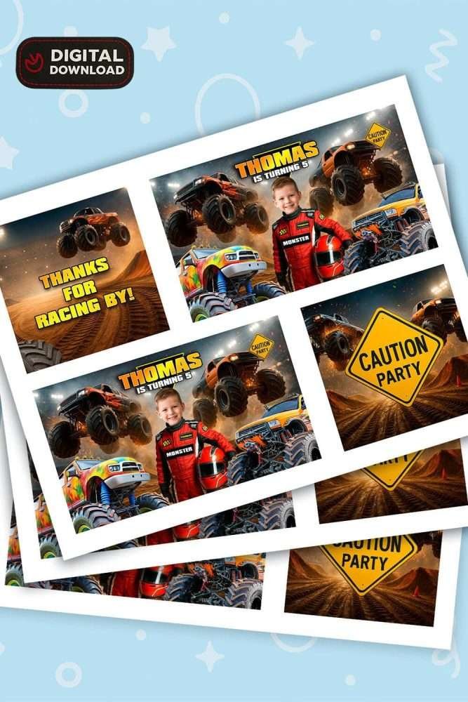 You’ll get a set of high-resolution JPEG/PNG files (300 DPI) personalized with your child’s name and age in a bold Monster Truck racing theme. Designed for gable boxes, party favors, or DIY decorations.