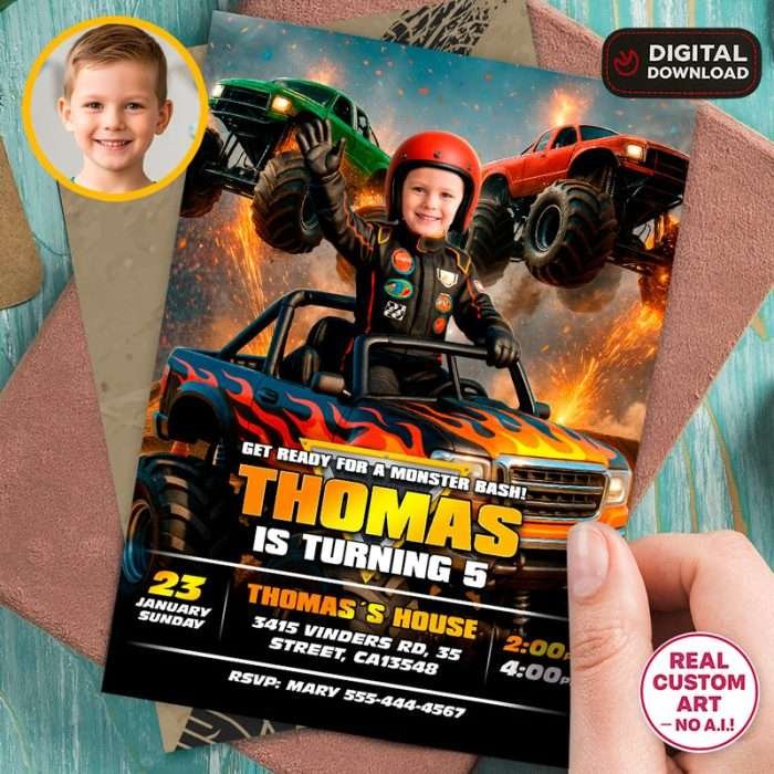 Each invitation is handcrafted in Adobe Photoshop by a professional designer — no AI, no generic templates. Your child’s face is seamlessly integrated behind the wheel of a powerful monster truck, complete with bold lighting, motion blur, and vivid colors that look like a real championship poster.