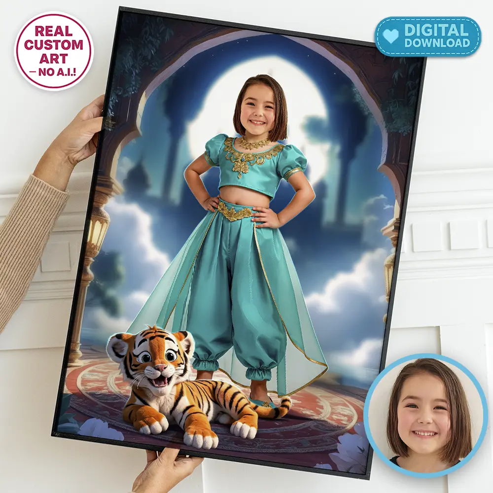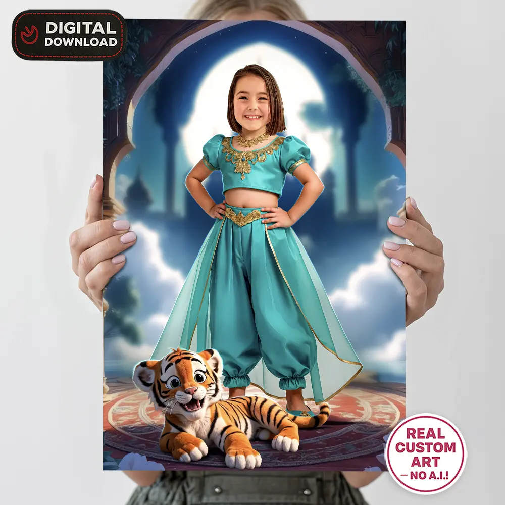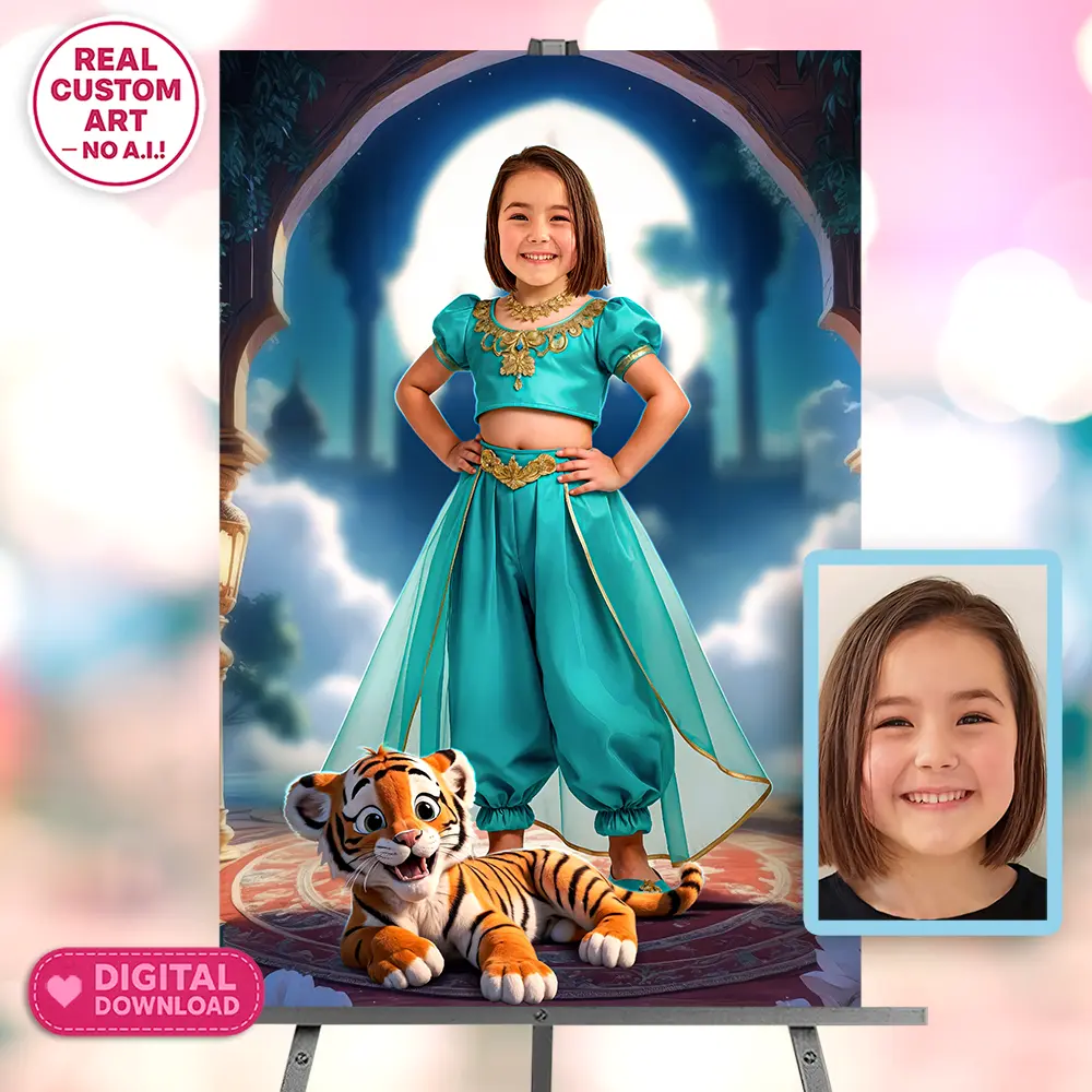 You’ll get a high-resolution JPEG file (300 DPI) personalized with your child’s photo transformed into a radiant Oasis Jewel Princess portrait. This artwork is designed as a keepsake or decoration for magical princess-themed birthdays.