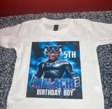 You will receive a high-resolution 5×7 inch JPEG (300 DPI) personalized with your child’s photo, name, age and event details in a black-and-purple panther-style superhero design. The file is print-ready and also works perfectly for digital sending.