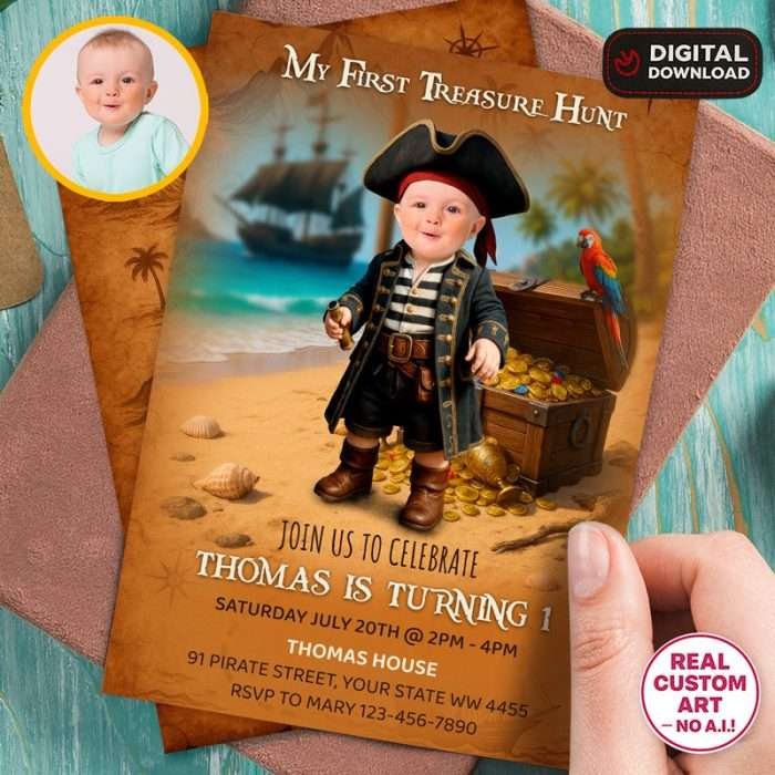 Celebrate your little one’s milestone with our Personalized Pirate Birthday Invitation, designed in an adventurous “My First Treasure Hunt” theme. This handcrafted digital artwork transforms your child into the fearless captain of their own treasure-hunting adventure — perfect for parents who want a unique, fun, and unforgettable way to announce a birthday celebration.