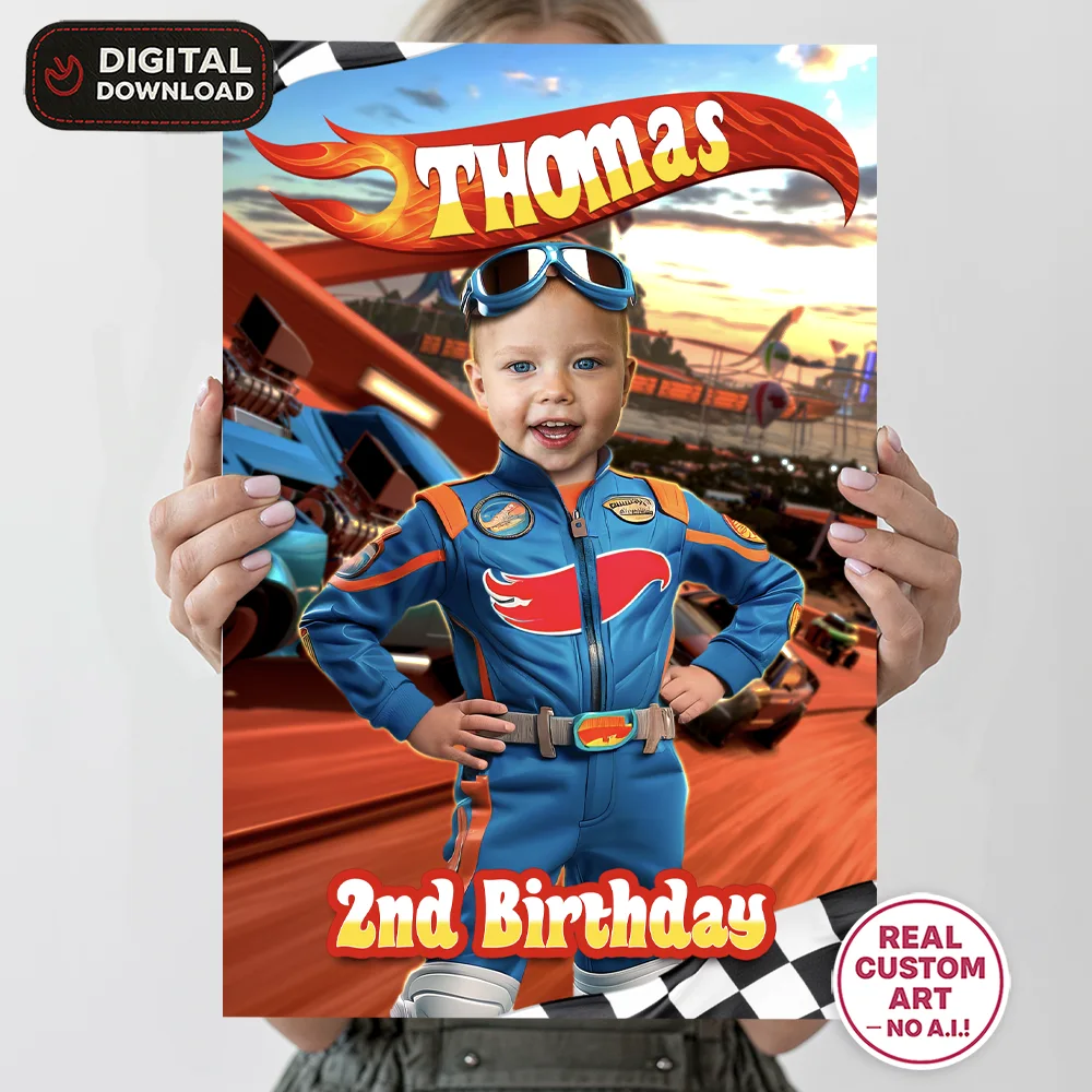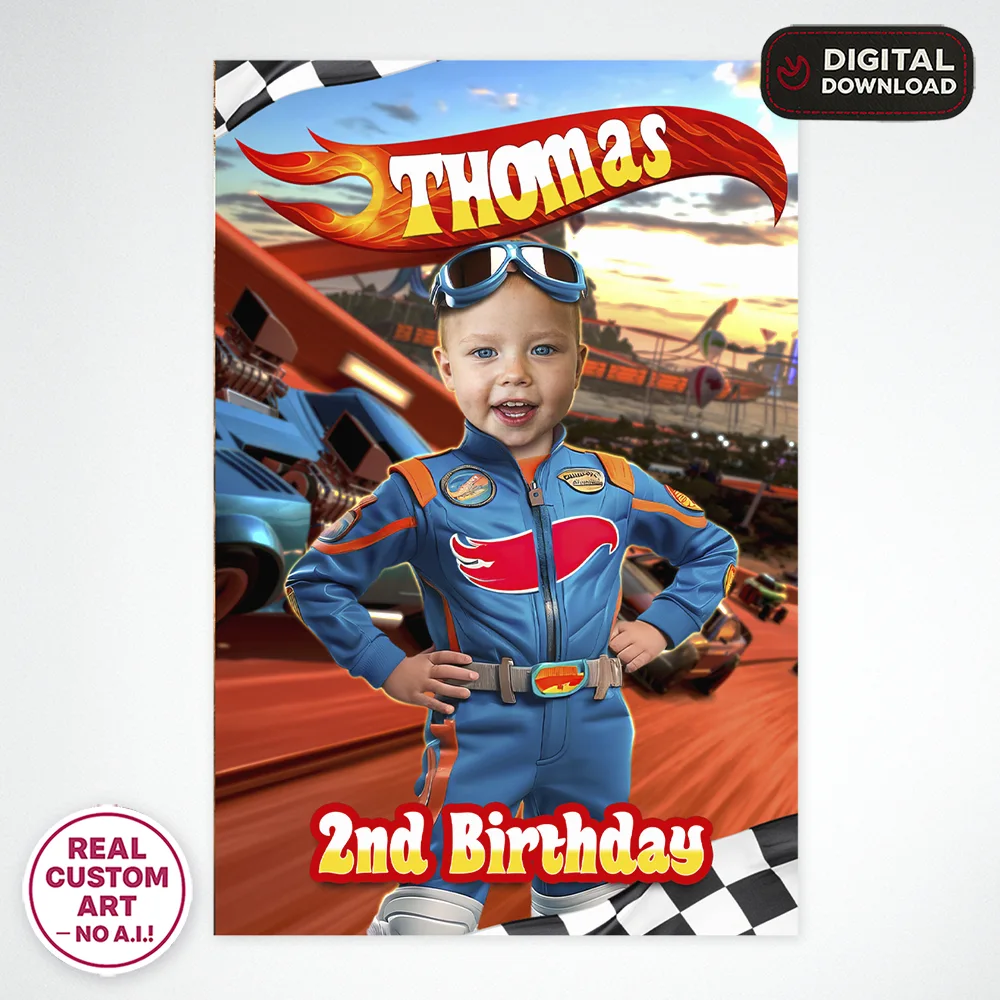 You’ll get a high-resolution JPEG file (300 DPI) customized with your child’s photo, name, and age in a bold racing theme. The file is optimized for large-format printing, making it perfect as an entrance sign, party table backdrop, or photo booth decoration.