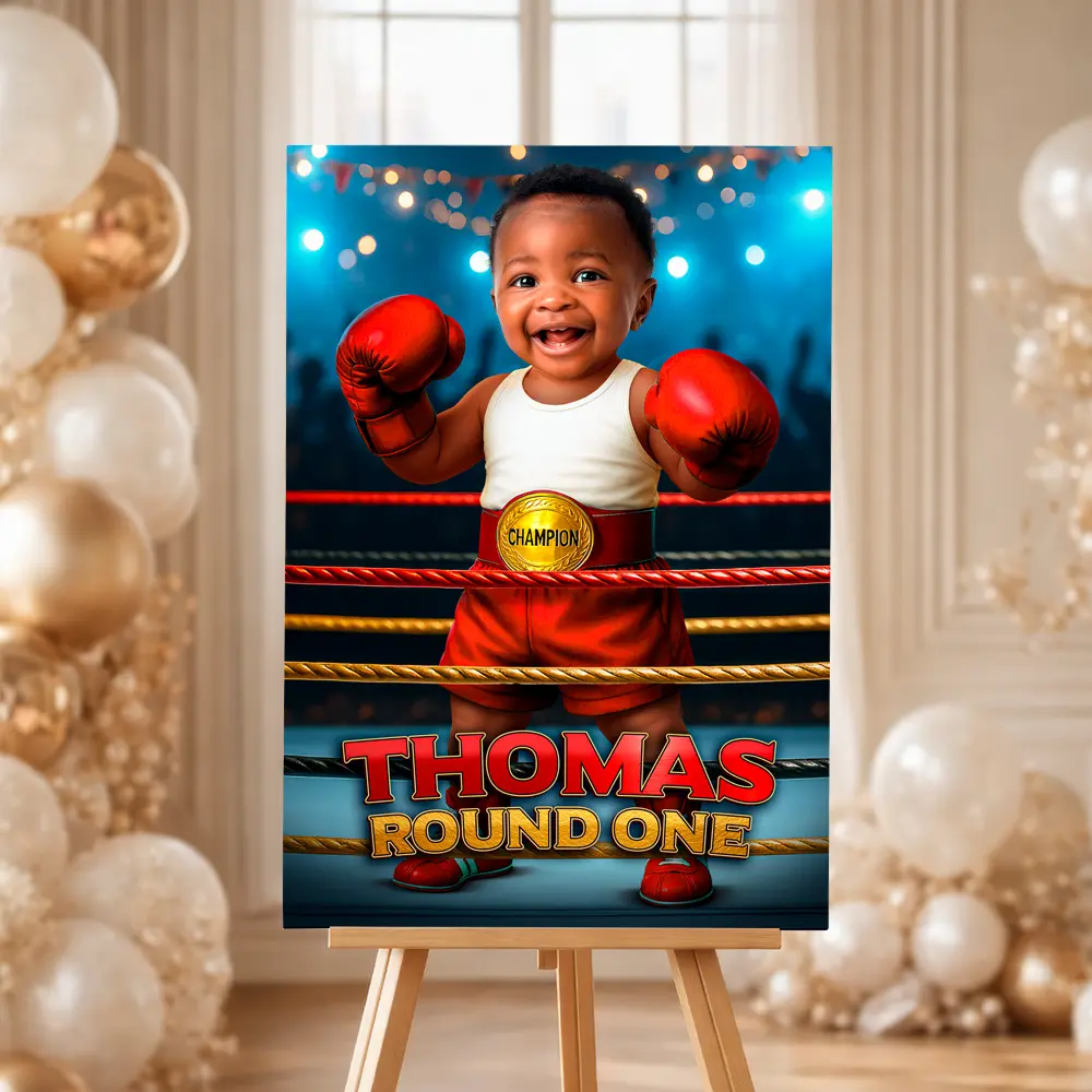 Make a knockout first impression with our Round One Red Baby Boxer Birthday Welcome Sign — featuring your little champ as the star of the show. With bold boxing graphics, powerful red accents, and professional design, this sign sets the championship tone from the very first moment.