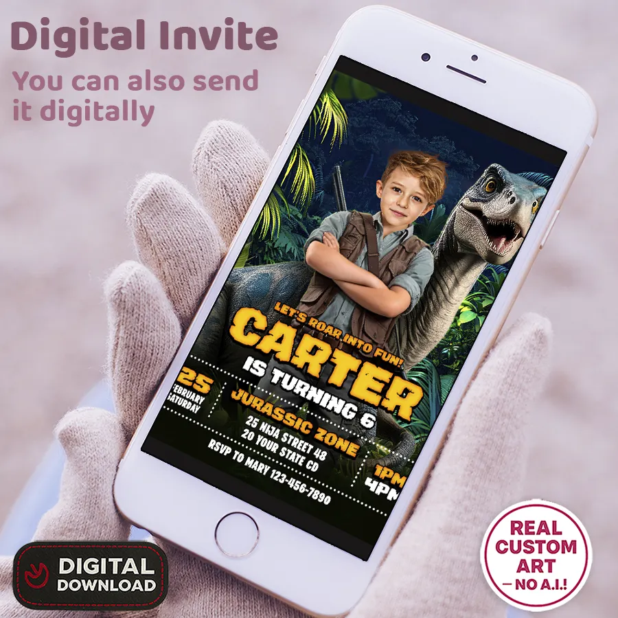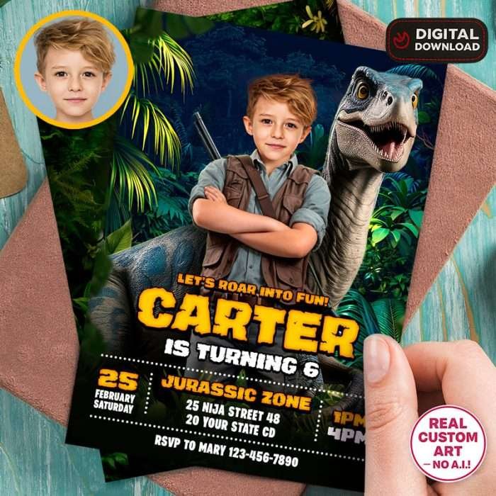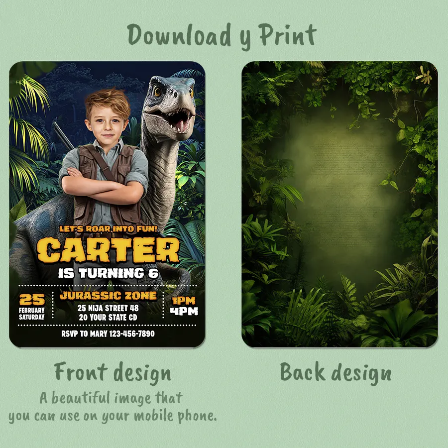 You’ll get a high-resolution JPEG file (300 DPI) personalized with your child’s photo, name, age, and party details in a Ranger & Raptor Jurassic Explorer theme. Standard size is 5×7 inches, ideal for printing or digital sharing.