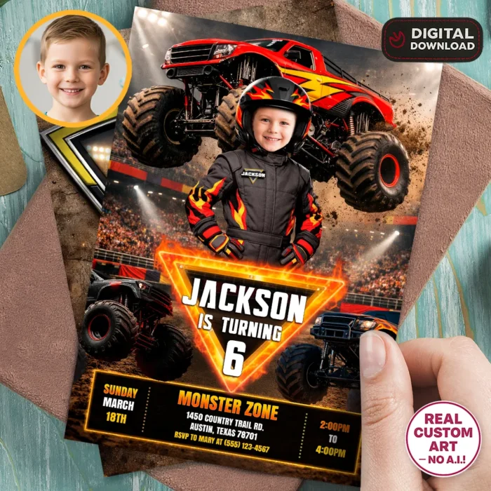 Birthday Photo Invitations → https://alicemagicparty.com/product-category/racing-birthday-party/monster-truck-birthday-party/monster-truck-invitations/