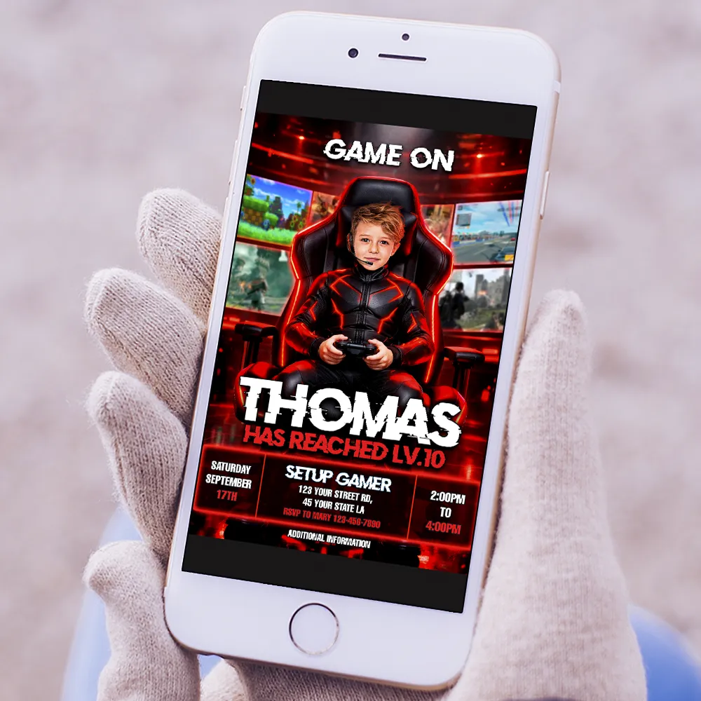 ✨ Level up your child’s birthday with this Personalized Red Gamer Birthday Invitation! Fully personalized with your child’s photo, this design transforms them into a gaming champion on their very own throne — the ultimate way to kick off an epic party.