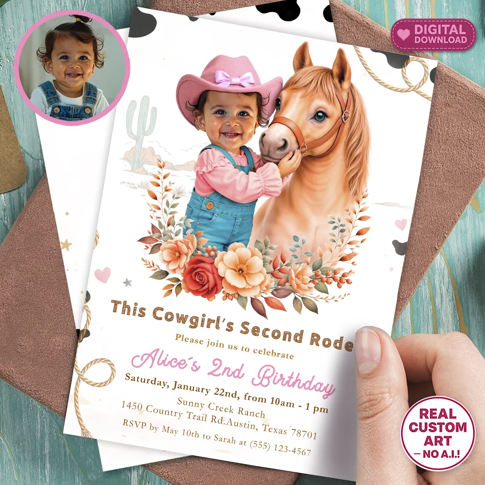 We take the stress out of the design process. With our professional manual photo editing, we don’t just put a face on a template; we carefully integrate your little cowgirl’s photo into the rancher outfit. The result is a high-quality, professional invitation that looks like a custom work of art.