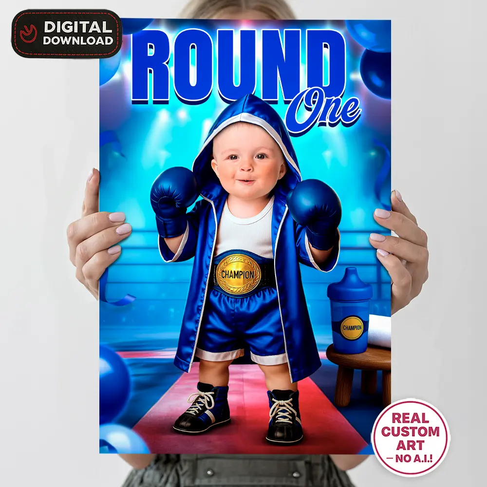 Welcome your guests with our Round One Baby Boxer Birthday Welcome Sign! A fully personalized digital design featuring your baby as the star of the ring. Delivered in 24h