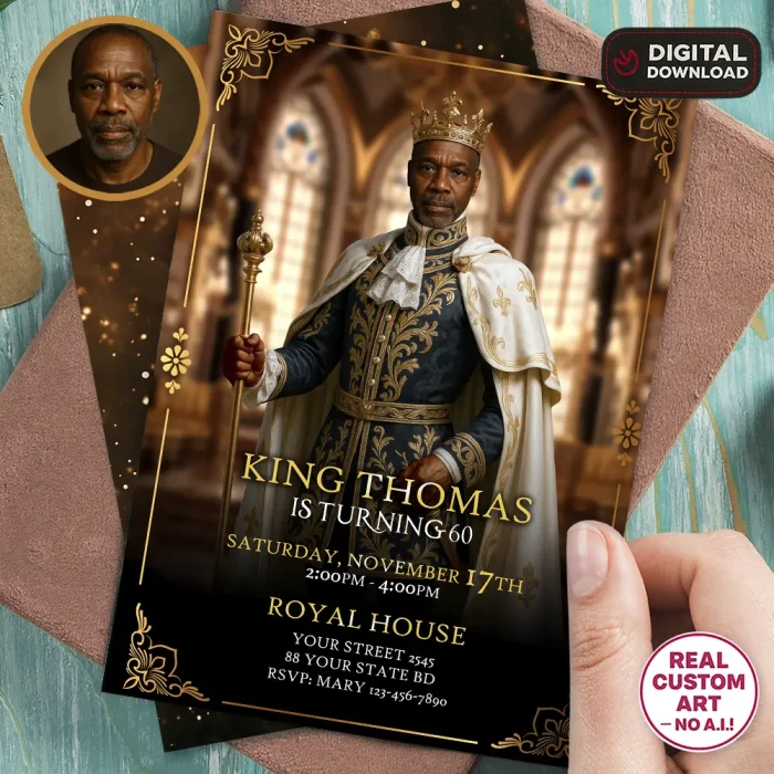 Every invitation is hand-edited in Adobe Photoshop by a professional designer — no AI, no templates. Your face is seamlessly integrated into an ornate royal outfit with natural shadows, balanced tones, and cinematic lighting. The result is elegant, realistic, and perfectly suited for milestone birthdays such as 30th, 40th, 50th, or 60th celebrations.