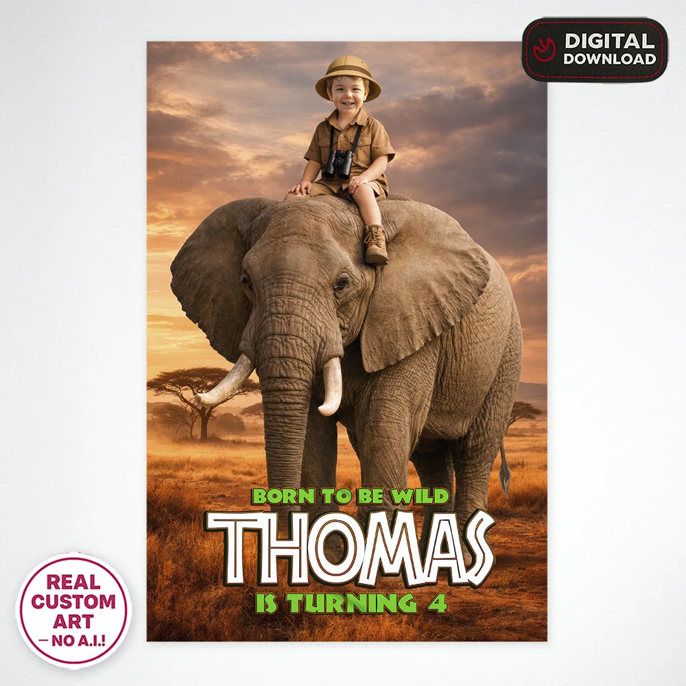 Safari Photo Welcome Sign with elephant design, personalized with your child’s photo. Hand-edited in Photoshop (no AI). Digital file delivered in 24 hours.