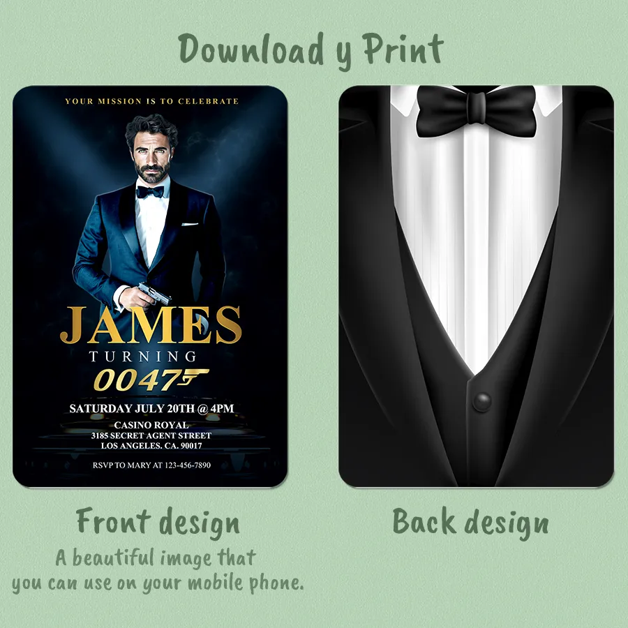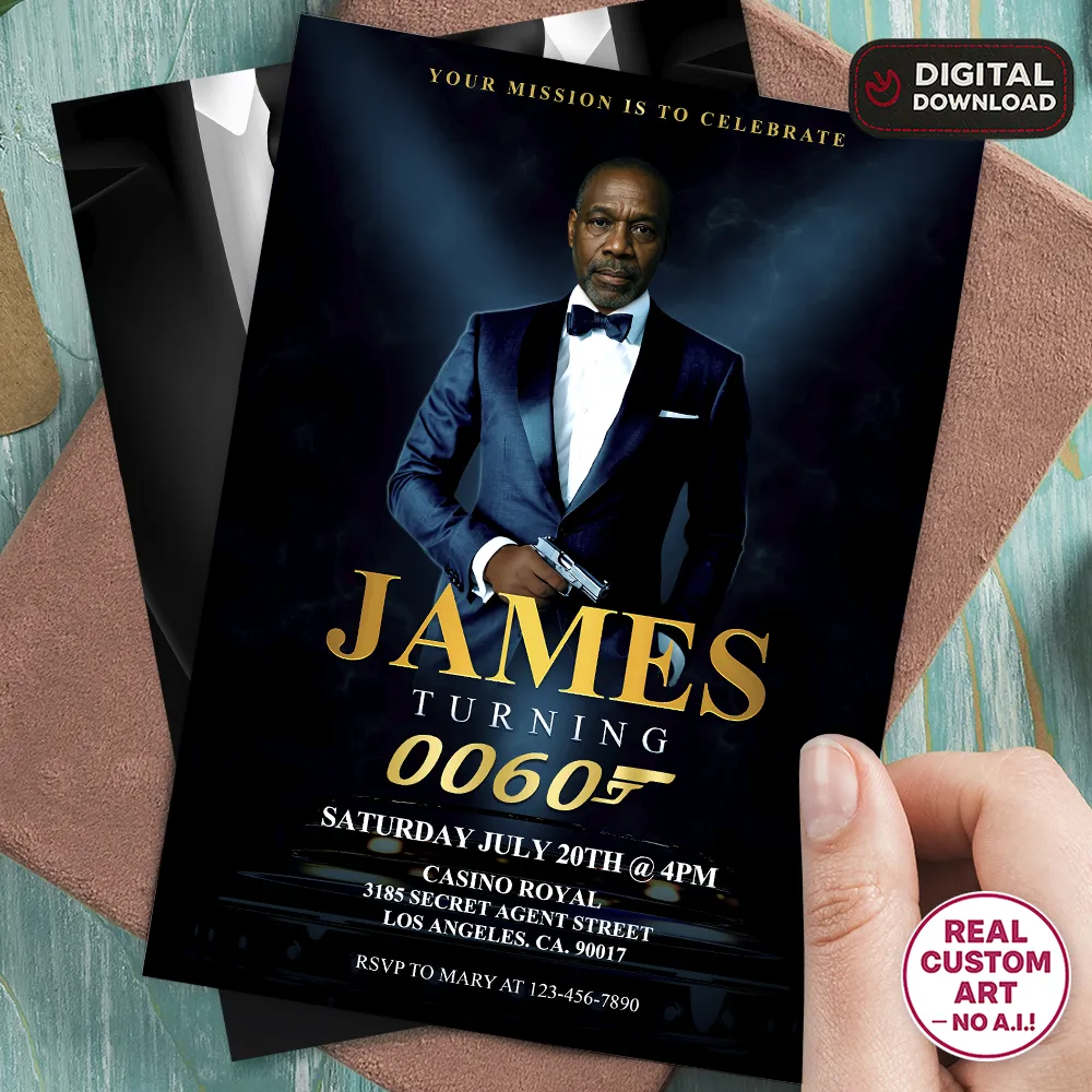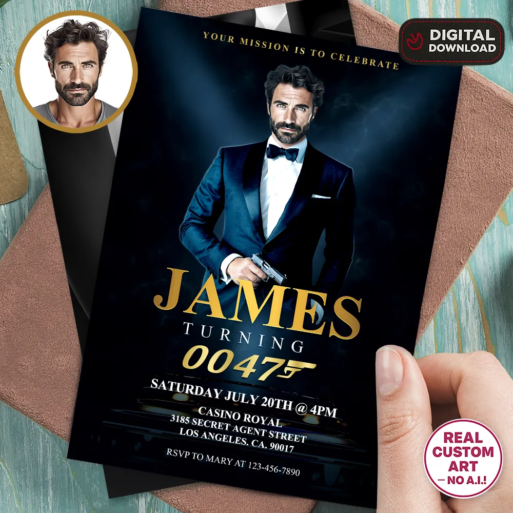 Every invitation is handcrafted in Adobe Photoshop by a professional designer — no AI and no mass templates. Your face is blended naturally into a tailored tuxedo or spy-themed outfit, with cinematic shadows and polished lighting for an authentic, sophisticated look.