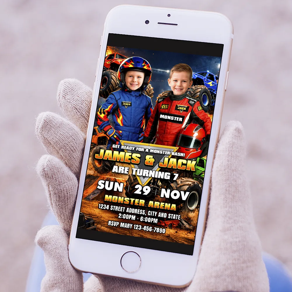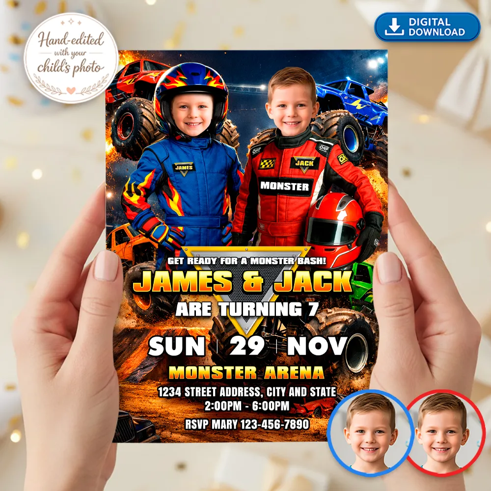 Siblings Monster Truck Invitation | Custom Big Wheels Party Invite
