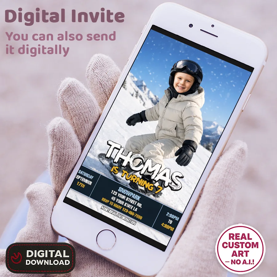 🏂 Snowboard Birthday Photo Invitation – Personalized Snowboard Invitation for Kids – Delivered in 24h – Digital File