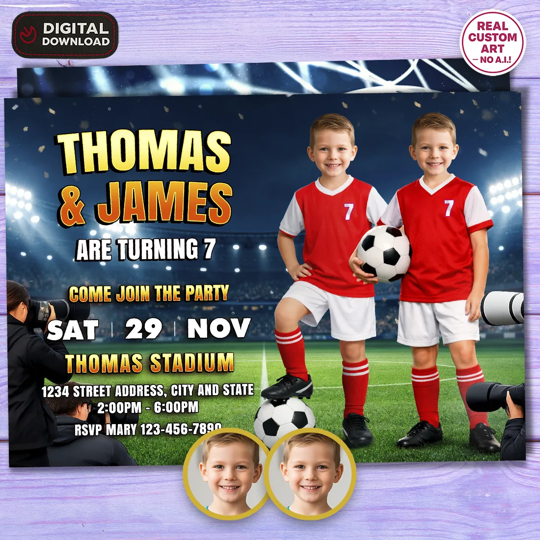 You’ll receive one high-resolution JPEG file (300 DPI) personalized with both children’s photos, names, ages, and shared party details in a coordinated soccer theme. Standard size is 5×7 inches, ideal for printing or digital sharing.