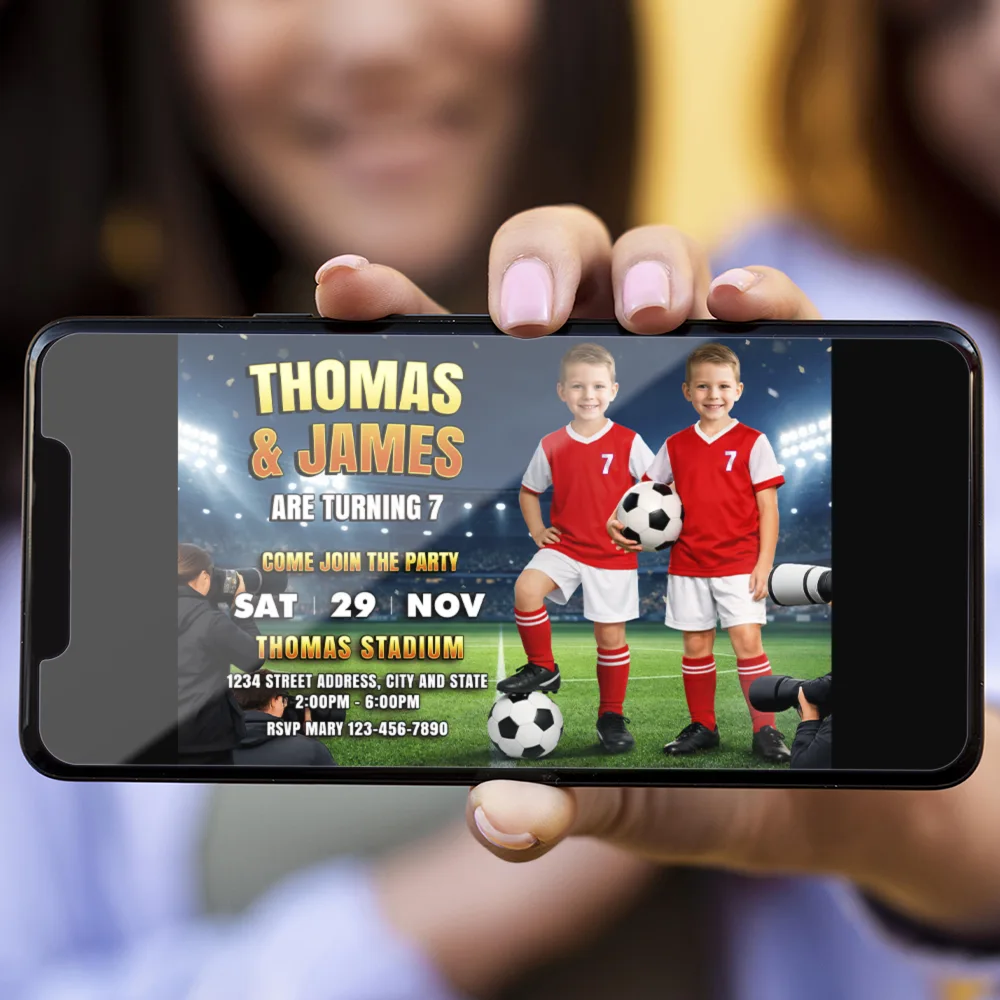 This dynamic, sporty design transforms both children into confident soccer players sharing the same stadium scene, complete with bright floodlights, lush green grass, soccer balls, and exciting match-day vibes. Perfect for siblings, twins, or shared birthdays, this invitation captures energy, teamwork, and fun in one unforgettable design.