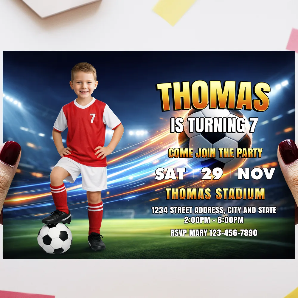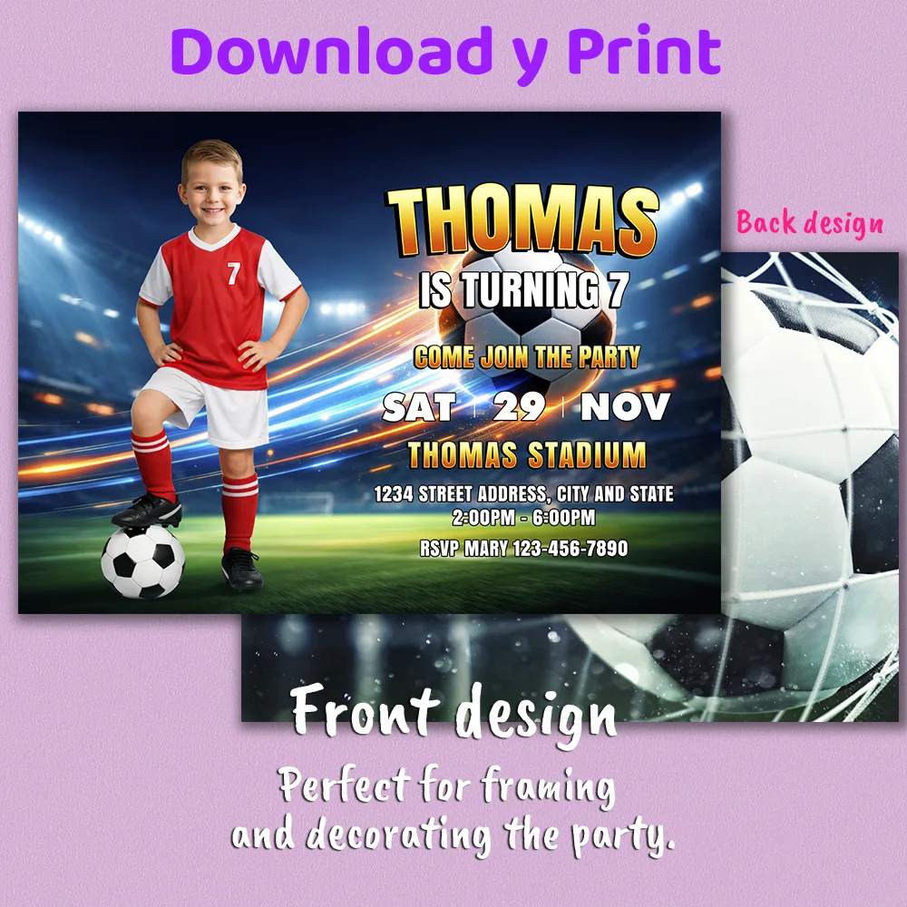 You’ll get a high-resolution JPEG file (300 DPI) personalized with your child’s photo, name, age, and party details in a fun soccer/football theme. Standard size is 5×7 inches, ideal for printing or digital sharing.