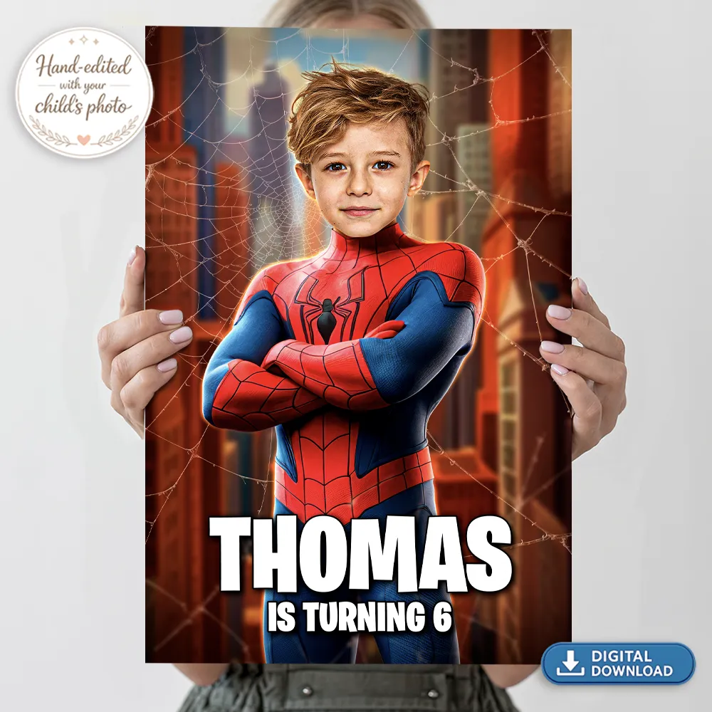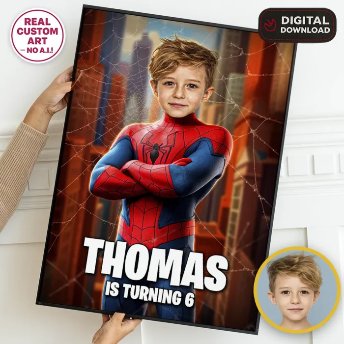 Every design is hand-edited in Adobe Photoshop — no AI, no templates. We seamlessly blend your child’s face with the hero suit and lighting effects, adding dramatic shadows, glowing accents and a cinematic atmosphere. The final result looks like a real superhero poster created just for your child.