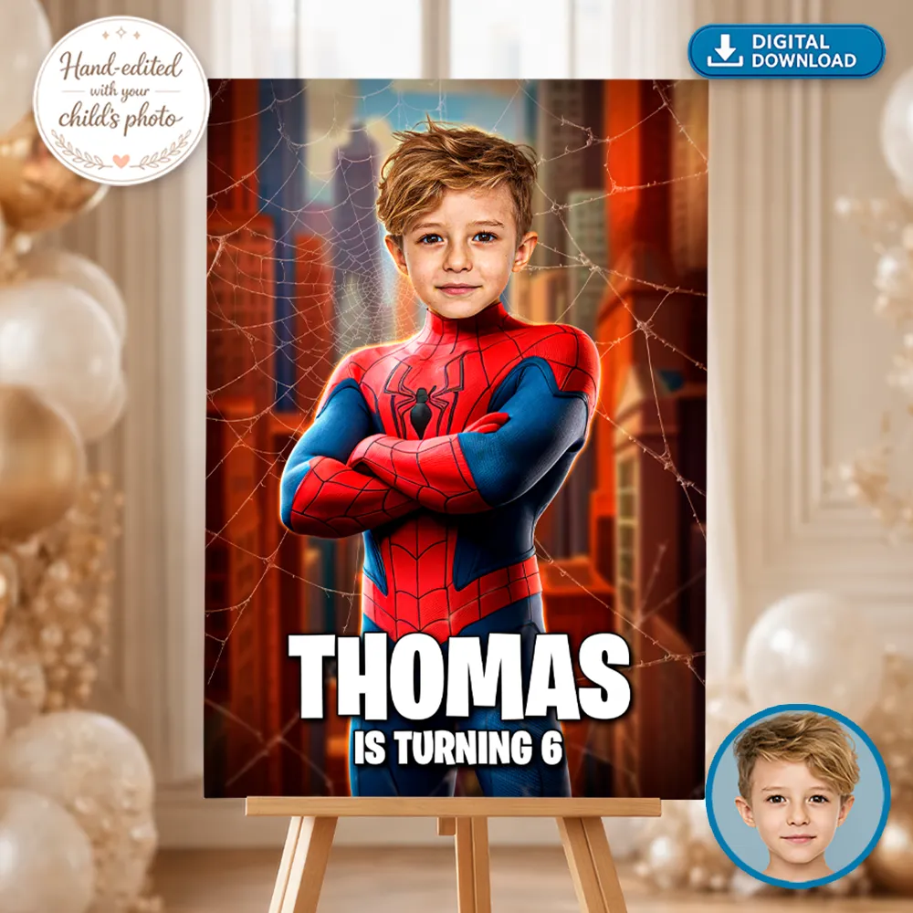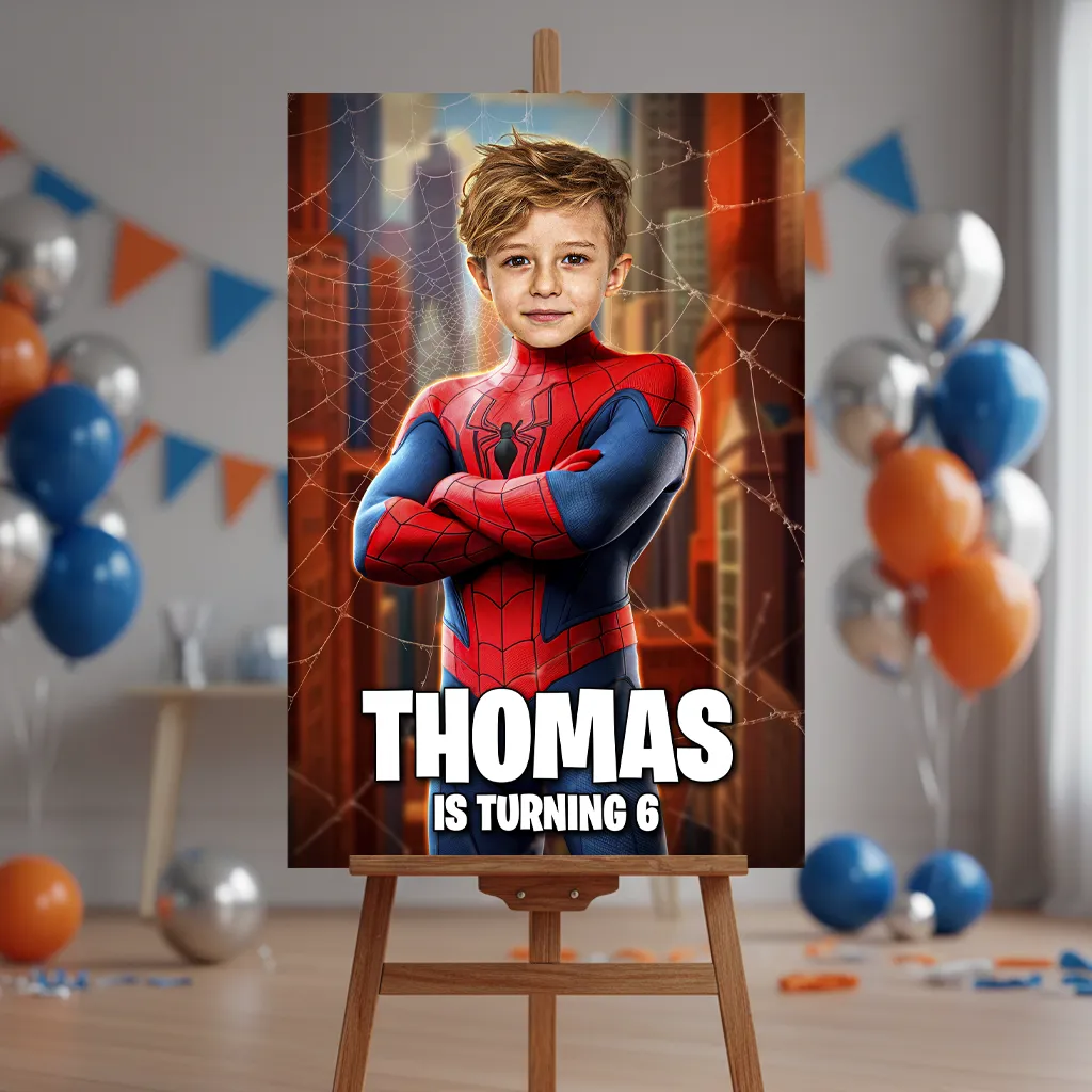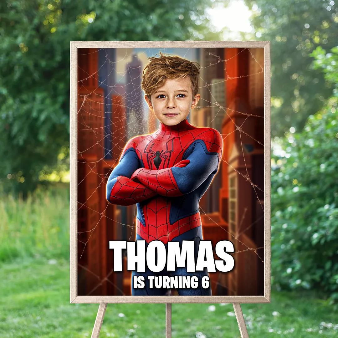 Step into action! Welcome guests to your child’s celebration with this Personalized Spider Web Hero Welcome Sign, featuring your child in a sleek black-and-purple hero suit surrounded by glowing energy, tribal-inspired patterns and futuristic lighting. It’s bold, powerful and the perfect statement piece for any action-themed party entrance.