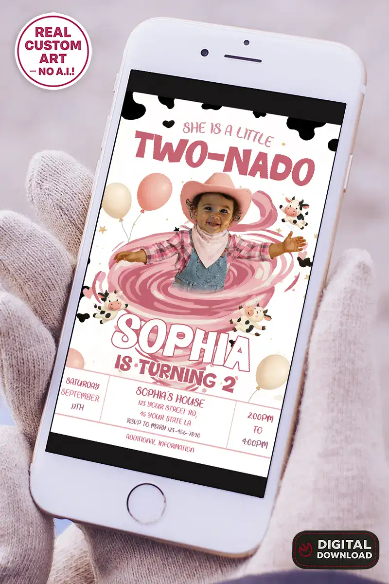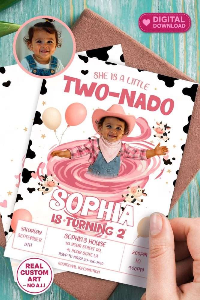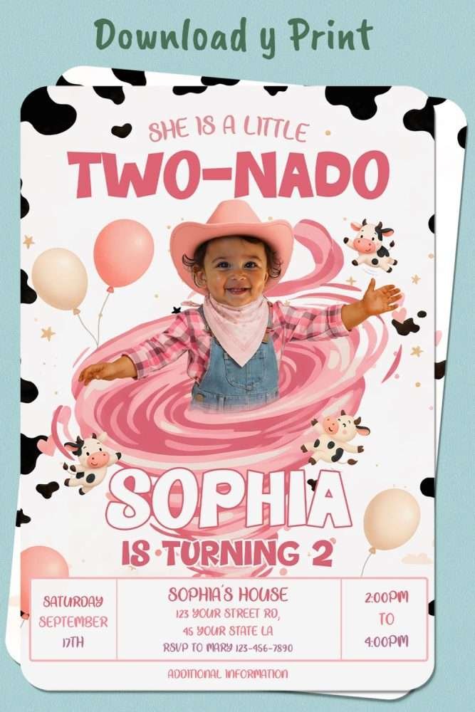🌪️🎀 Two-Nado Birthday Invitation with Photo (Girl, Pink) – Rodeo Accents – Personalized 5×7 Vertical (24h Delivery) – Digital Download