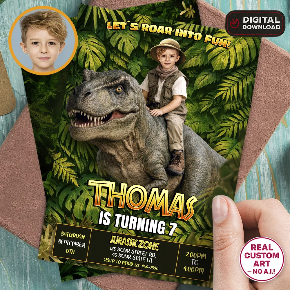 🦖 Tyrannosaurus Party Invitation – Custom Jurassic Birthday Photo Invitation – Delivered in 24h – Digital File