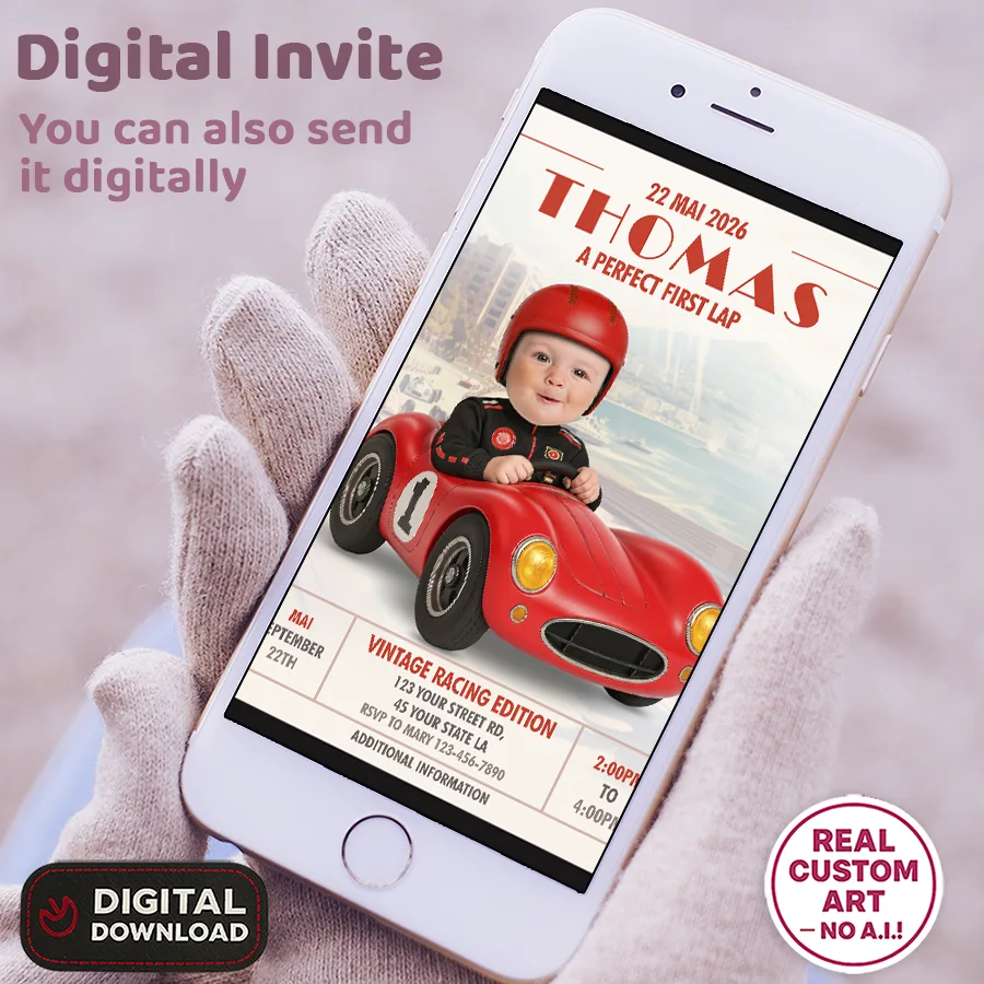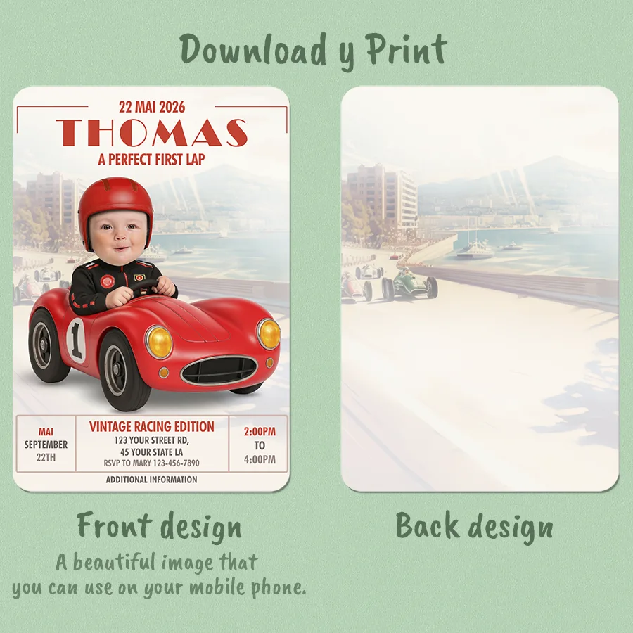 The secret to our high-speed invites is our expert manual photo editing. To achieve that authentic vintage look, our designers manually integrate your child’s face into the racing scene. We carefully adjust the grain, the warm retro lighting, and the shadows to ensure the photo matches the classic style of the invitation perfectly. We don’t use automated AI tools; we hand-craft the integration to make your little driver look like a real racing champion from the golden age of motorsports.