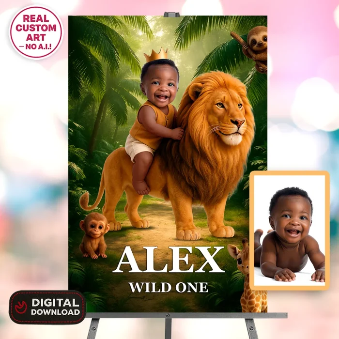 Welcome guests with a handcrafted Wild One Lion Photo Welcome Sign. 16×24″ high-res poster, proof in 24h. No AI or templates.