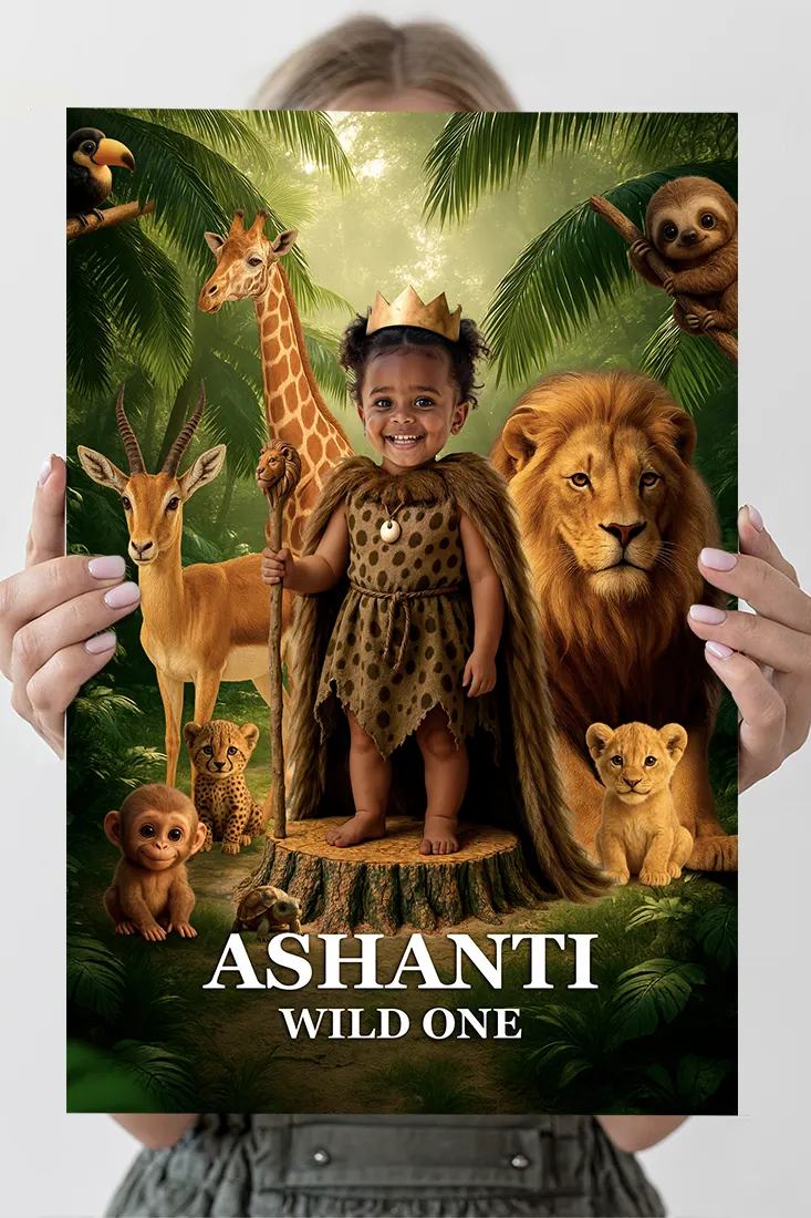 We place your child in a refined jungle/safari scene with watercolor-style greenery, pampas grass, soft gold/khaki accents, and friendly animals (giraffe, elephant, lion, zebra — choose your favorites). Subtle paper grain and gentle rim lighting make the print look photography-ready while preserving natural skin tones.