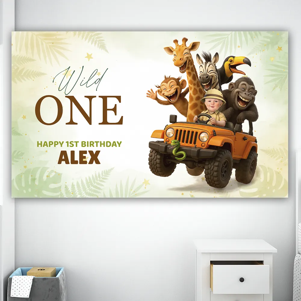 Create a stunning Wild One Safari birthday banner with photo. Hand-edited, 60×36″ horizontal, high-res JPEG, proof in 24h.