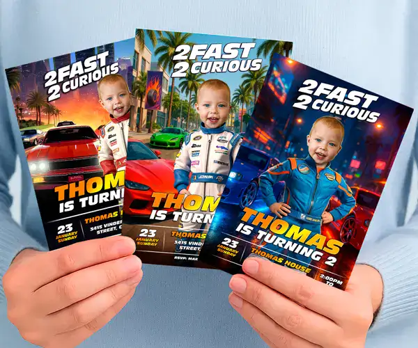 A Two Fast Birthday Party is playful, full of energy, and loved by families. With photo-personalized invitations, portraits, and printable decorations, you get a cohesive, professional look in under 24 hours — no templates, no AI.